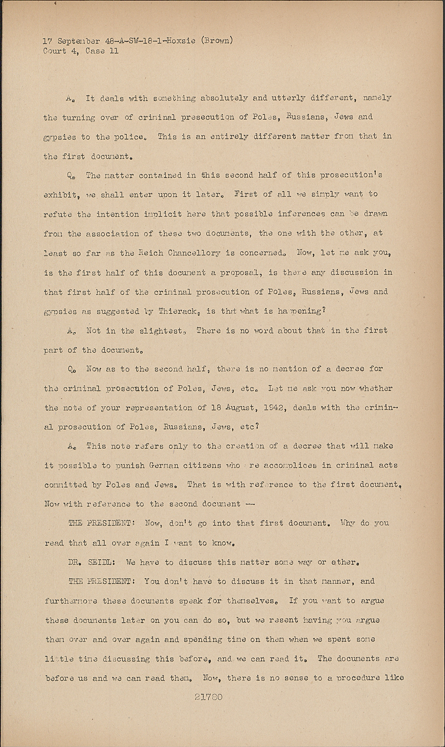 Q.Now as to the second half, there is no mention of a decree for the criminal prosecution of Poles, Jews, etc. Let me ask you now whether the note of your representation of 18 August, 1942, deals with the criminal prosecution of Poles, Russians, Jews, etc?