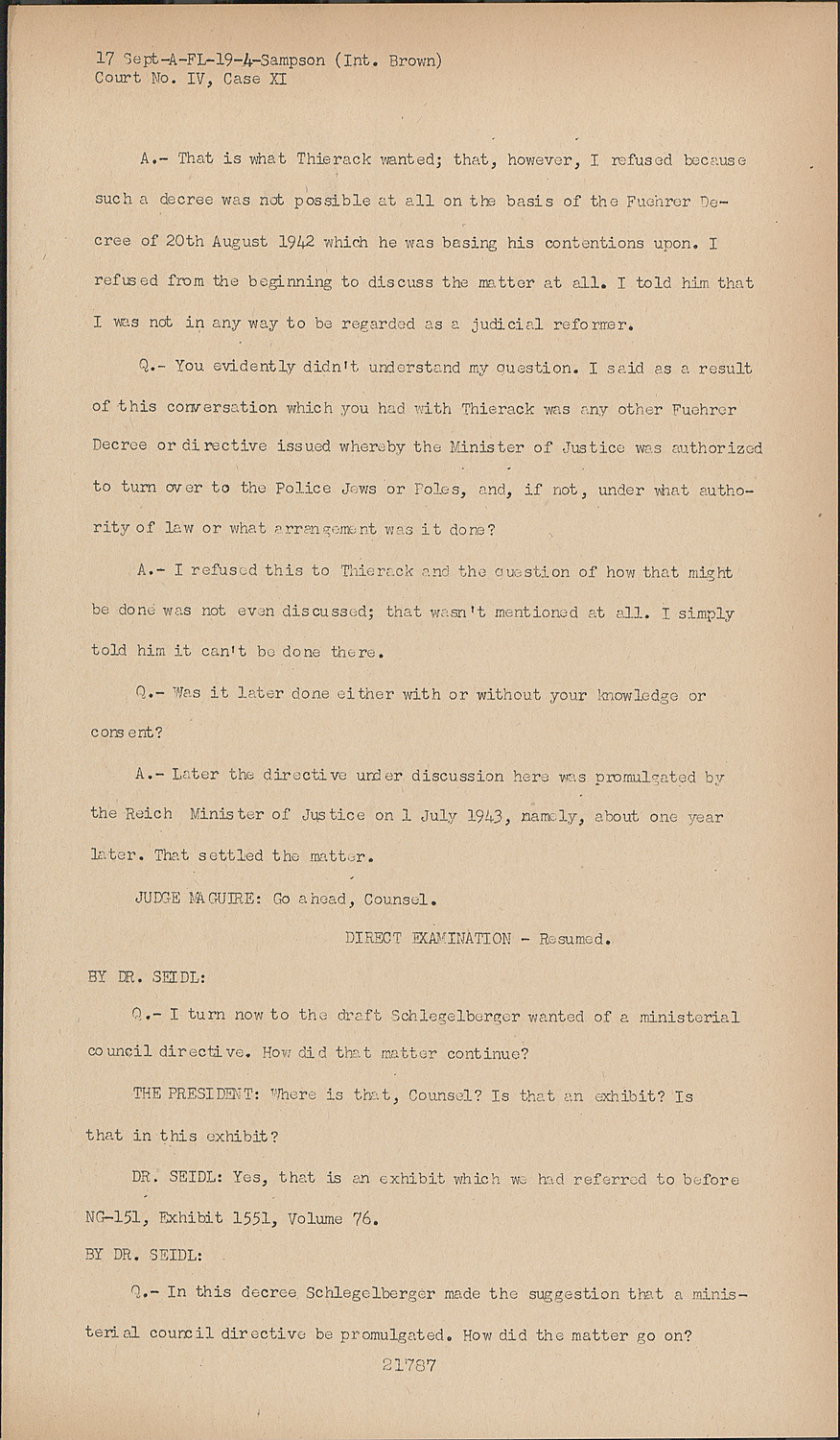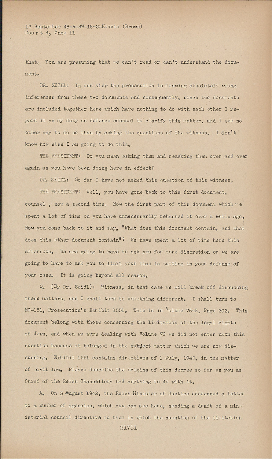 Q. (By Dr. Seidl): Witness, in that case we will break off discussing these matters, and I shall turn to something different. I shall turn to NG-151, Prosecution's Exhibit 1551. This is in Volume 76-B, Page 303. This document belong with those concerning the limitation of the legal rights of Jews, and when we were dealing with Volume 76 we did not enter upon this question because it belonged in the subject matter which we are now discussing. Exhibit 1551 contains directives of 1 July, 1943, in the matter of civil law. Please describe the origins of this decree so far as you as Chief of the Reich Chancellery had anything to do with it, .