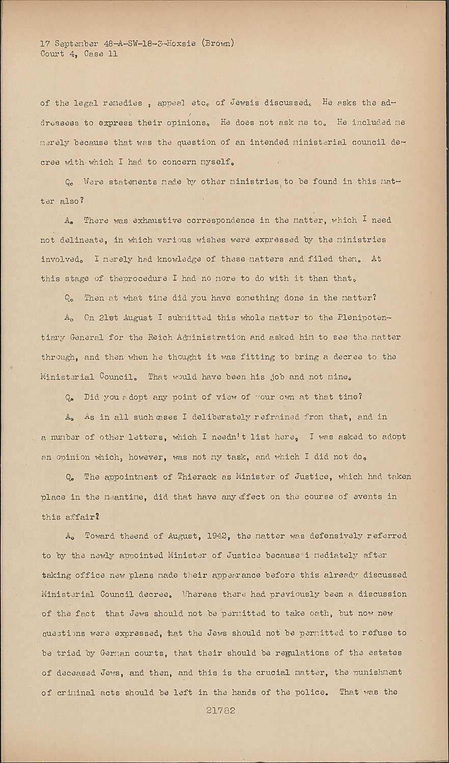 A.Toward theend of August, 1942, the matter was defensively referred to by the newly appointed Minister of Justice because immediately after taking office new plans made their appearance before this already discussed Ministerial Council decree. Whereas there had previously been a discussion of the fact that Jews should not be permitted to take oath, but now new questixns were expressed, that the Jews should not be permitted to refuse to be tried by German courts, that their should be regulations of the estates of deceased Jews, and then, and this is the crucial matter, the punishment of criminal acts should be left in the hands of the police. That was the influence that Thierack made felt after his appointment as Minister of Justice.