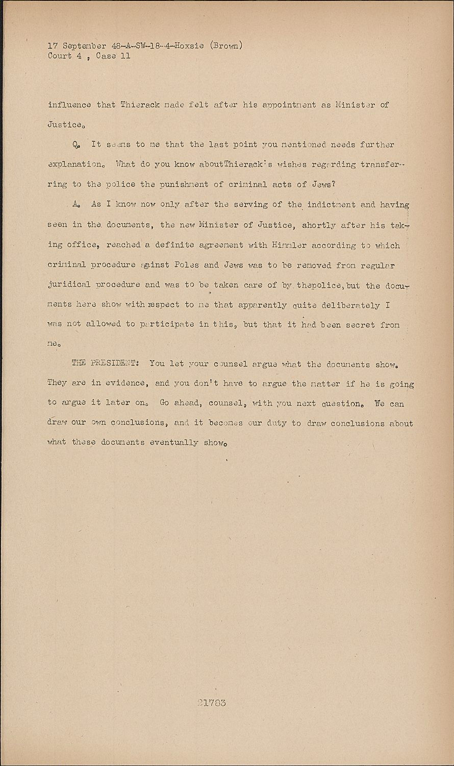 Q.It seems to me that the last point you mentioned needs further explanation. What do you know aboutThierack's wishes regarding transferring to the police the punishment of criminal acts of Jews?