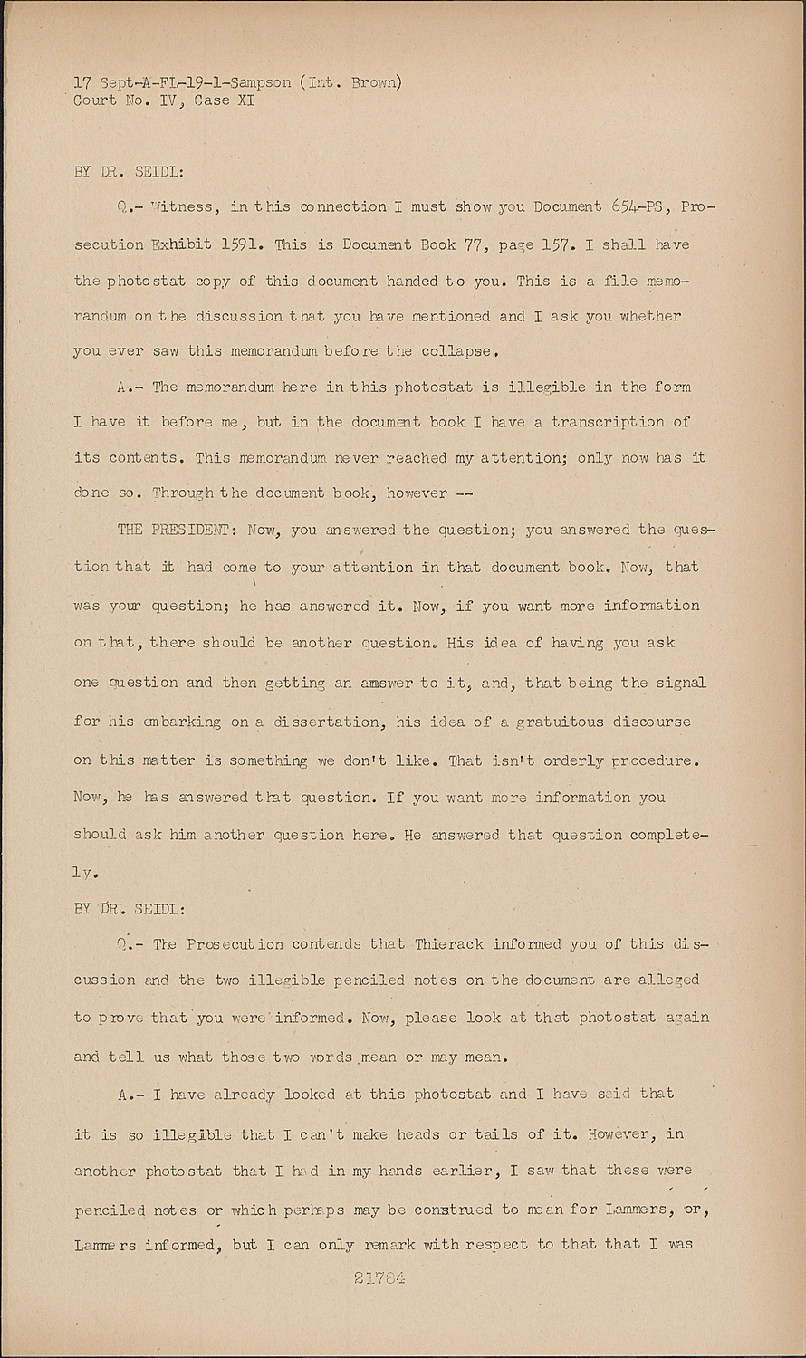 THE PRESIDENT:Now, you answered the question; you answered the question that it had come to your attention in that document book. Now, that was your question; he has answered it. Now, if you want more information on that, there should be another question. His idea of having you ask one question and then getting an answer to it, and, that being the signal for his embarking on a dissertation, his idea of a gratuitous discourse on this matter is something we don't like. That isn't orderly procedure. Now, he has answered that question. If you want more information you should ask him another question here. He answered that question completely. BY dR. SEIDL: