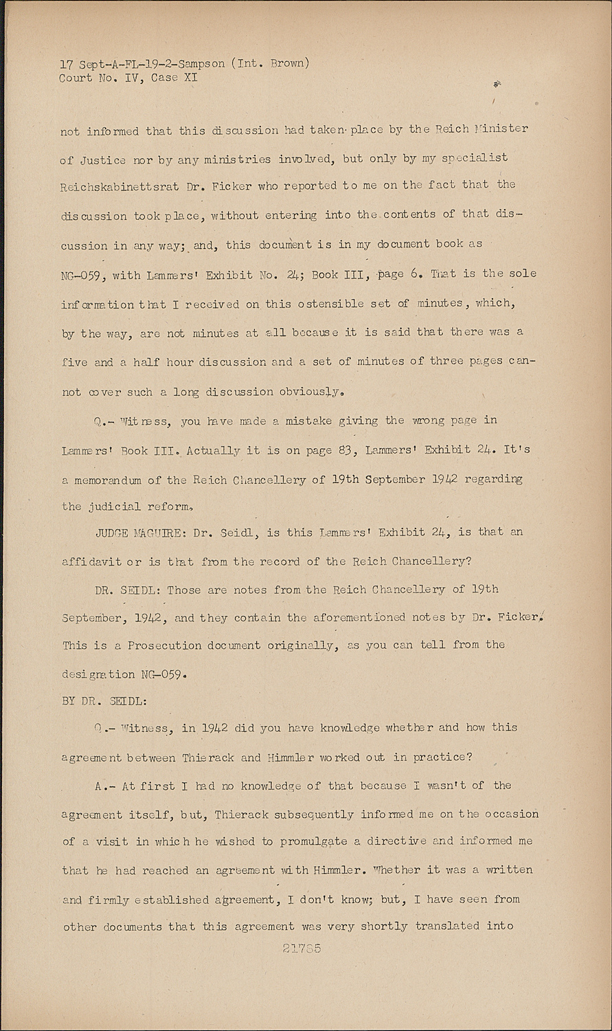 Q.- Witness, you have made a mistake giving the wrong page in Lammers' Book III. Actually it is on page 83, Lammers' Exhibit 24. It's a memorandum of the Reich Chancellery of 19th September 1942 regarding the judicial reform.