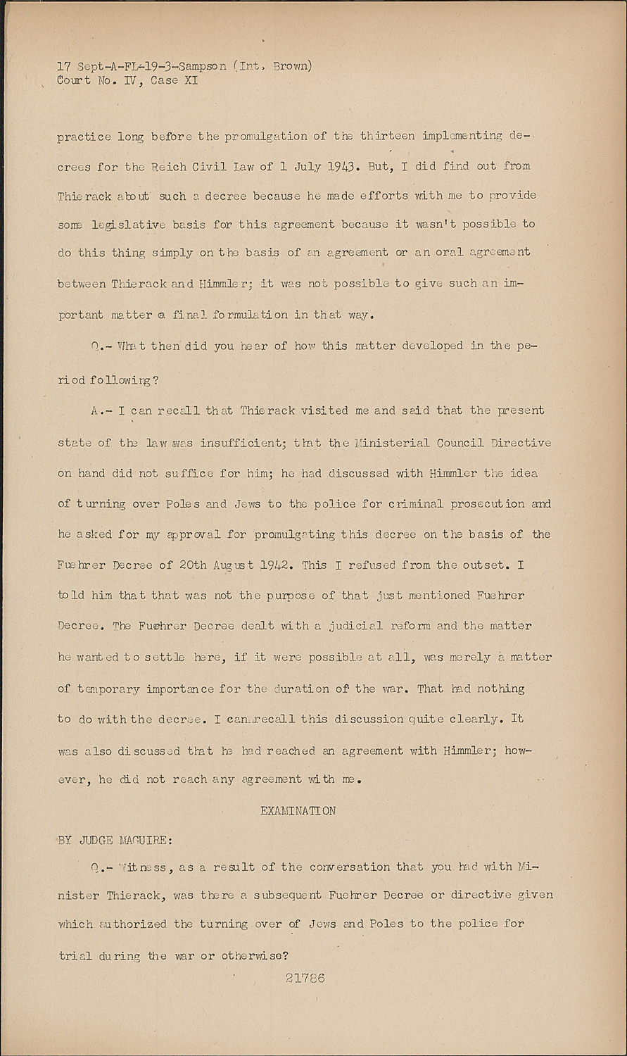 A.- At first I had no knowledge of that because I wasn't of the agreement itself, but, Thierack subsequently informed me on the occasion of a visit in which he wished to promulgate a directive and informed me that he had reached an agreement with Himmler. Whether it was a written and firmly established agreement, I don't know; but, I have seen from other documents that this agreement was very shortly translated into practice long before the promulgation of the thirteen implementing decrees for the Reich Civil law of 1 July 1943.