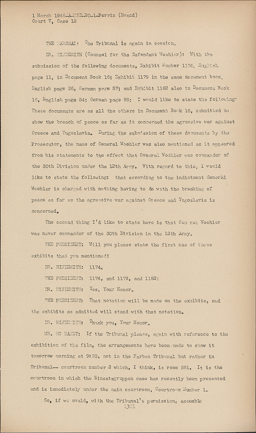 DR.HINDEMITH (Counsel for the Defendant Woehler): With the submission of the following documents, Exhibit dumber 1174. English page ll, in Document Book 16; Exhibit 1179 in the same document booK. English page 36, German page 57; and Exhibit 1182 also in Document Book 16, English page 54; German page 85; I would like to state the following' These documents are as all the others in Document Book 16, submitted to show the breach of peace as far as it concerned the agressive war against Greece and Yugoslavia. During the submission of these documents by the Prosecutor, the name of General Woehler was also mentioned as it appeared from his statements to the effect that General Woehler was commander of the 30th Division under the 12th Army. With regard to this: I would like to state the following: that according to the indictment General Woehler is charged with nothing having to do with the breaking of peace as far as the agressive war against Greece and Yugoslavia is concerned.