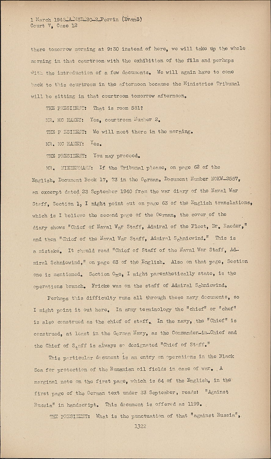 MR. NIEDERMANN:If the Tribunal please, on page 62 of the English, Document Book 17, 73 in the German, Document Number NOKW-2557, an excerpt dated 23 September 1940 from the war diary of the Naval War Staff, Section 1, I might point out on page 63 of the English translations, which is I believe the second page of the German, the cover of the diary shows "Chief of Naval War Staff, Admiral of the Elect, Dr. Raeder," and then "Chief of the Naval War Staff, Admiral Schniewind." This is a mistake. It should read "Chief of Staff of the Naval War Staff, Admiral Schniewind," on page 63 of the English. Also on that page, Section one is mentioned. Section One, I might parenthetically state, is the operations branch. Fricke was on the staff of Admiral Schniewind.