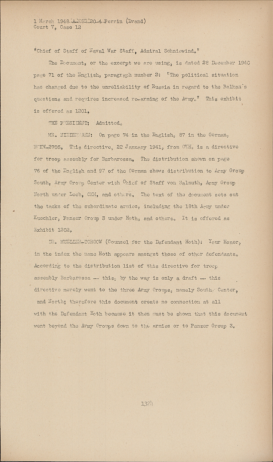 DR.MUELLER-TORGOW (Counsel for the Defendant Hoth): Your Honor, in the index the name Hoth appears amongst those of other defendants. According to the distribution list of this directive for troop assembly Barbarossa -- this, by the way is only a draft -- this directive merely went to the three Army Groups, namely South, Center, and North; therefore this document creats no connection at all with the Defendant Hoth because it then must be shown that this document went beyond the Army Groups down to the armies or to Panzer Group 3.