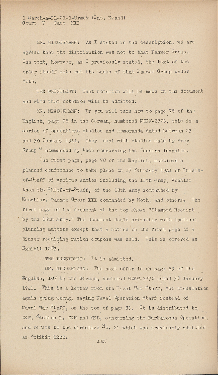 MR. NIEDERMANN:The next offer is on page 83 of the English, 107 in the German, numbered NOKW-2270 dated 30 January 1941. This is a letter from the Naval War Staff, the translation again going wrong, saying Naval Operation Staff instead of Naval War staff, on the top of page 83, It is distributed to. OKW, Section L, OKH and OKL, concerning the Barbarossa Operation, and refers to the directive No. 21 which was previously admitted as Exhibit 1200.