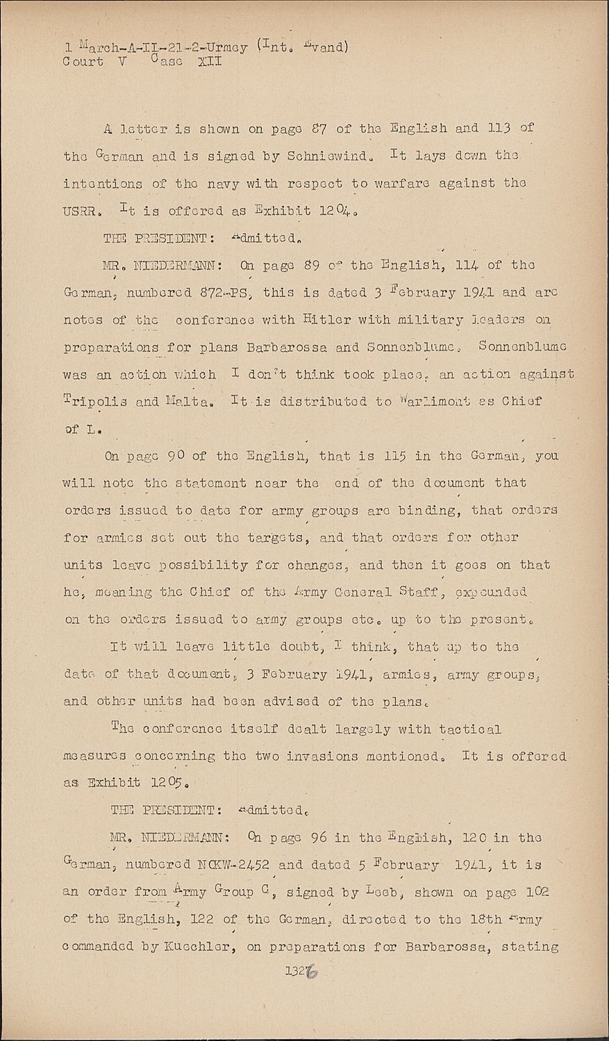 MR. NIEDERMANN:On page 89 the English, 114 of the German, numbered 872-PS, this is dated 3 February 1941 and are notes of the conference with Hitler with military leaders on preparations for plans Barbarossa and Sonnenblume. Sonnenblume was an action which I don't think took place, an action against Tripolis and Malta. It is distributed to Warlimont es Chief of L.