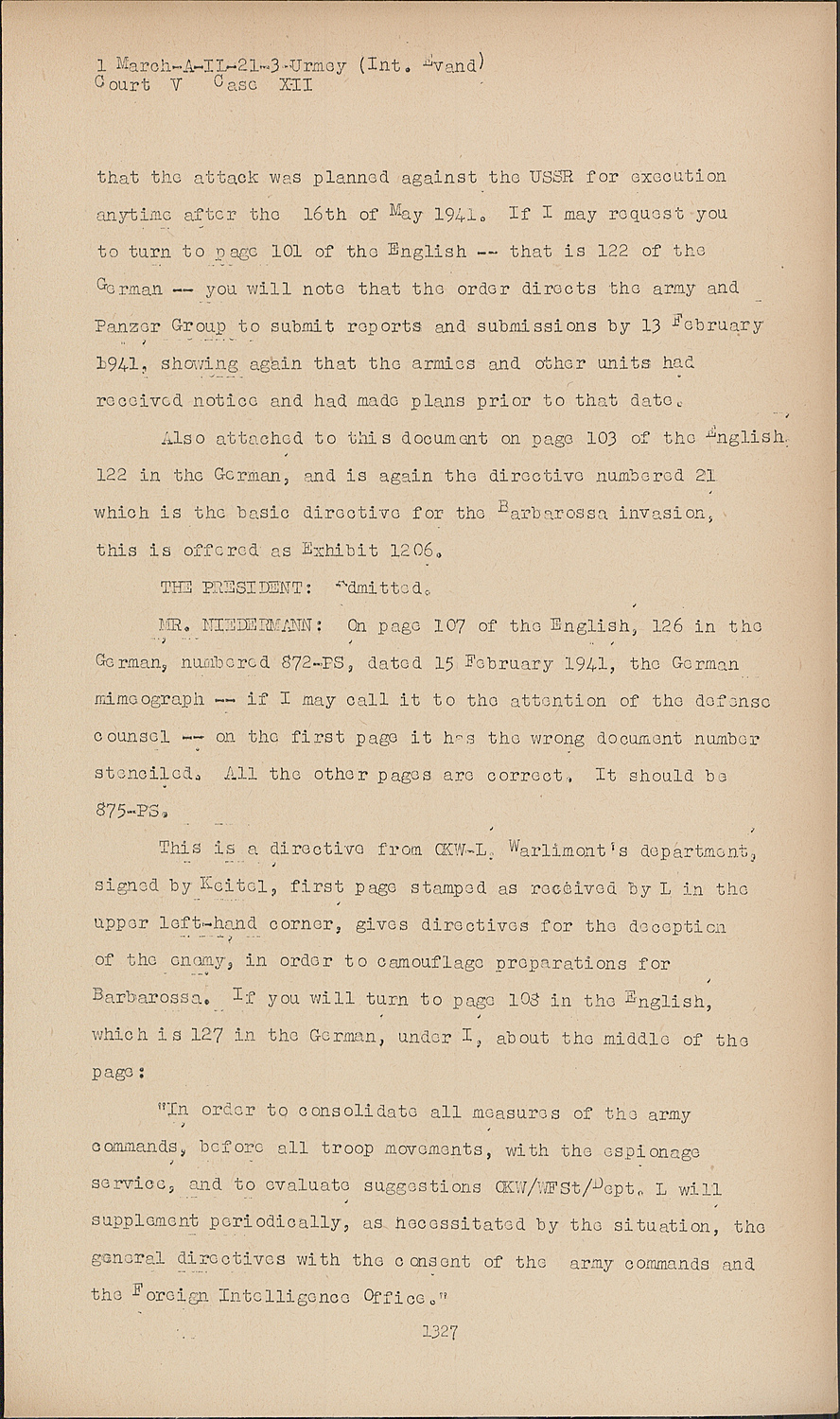 If I may request you to turn to page 101 of the English -- that is 122 of the German -- you will note that the order directs the army and Panzer Group to submit reports and submissions by 13 February 1941, showing again that the armies and other units had received notice and had made plans prior to that datoL Also attached to this document on page 103 of the English 122 in the German, and is again the directive numbered 21 which is the basic directive for the Barbarossa invasion this is offered as Exhibit 1206.