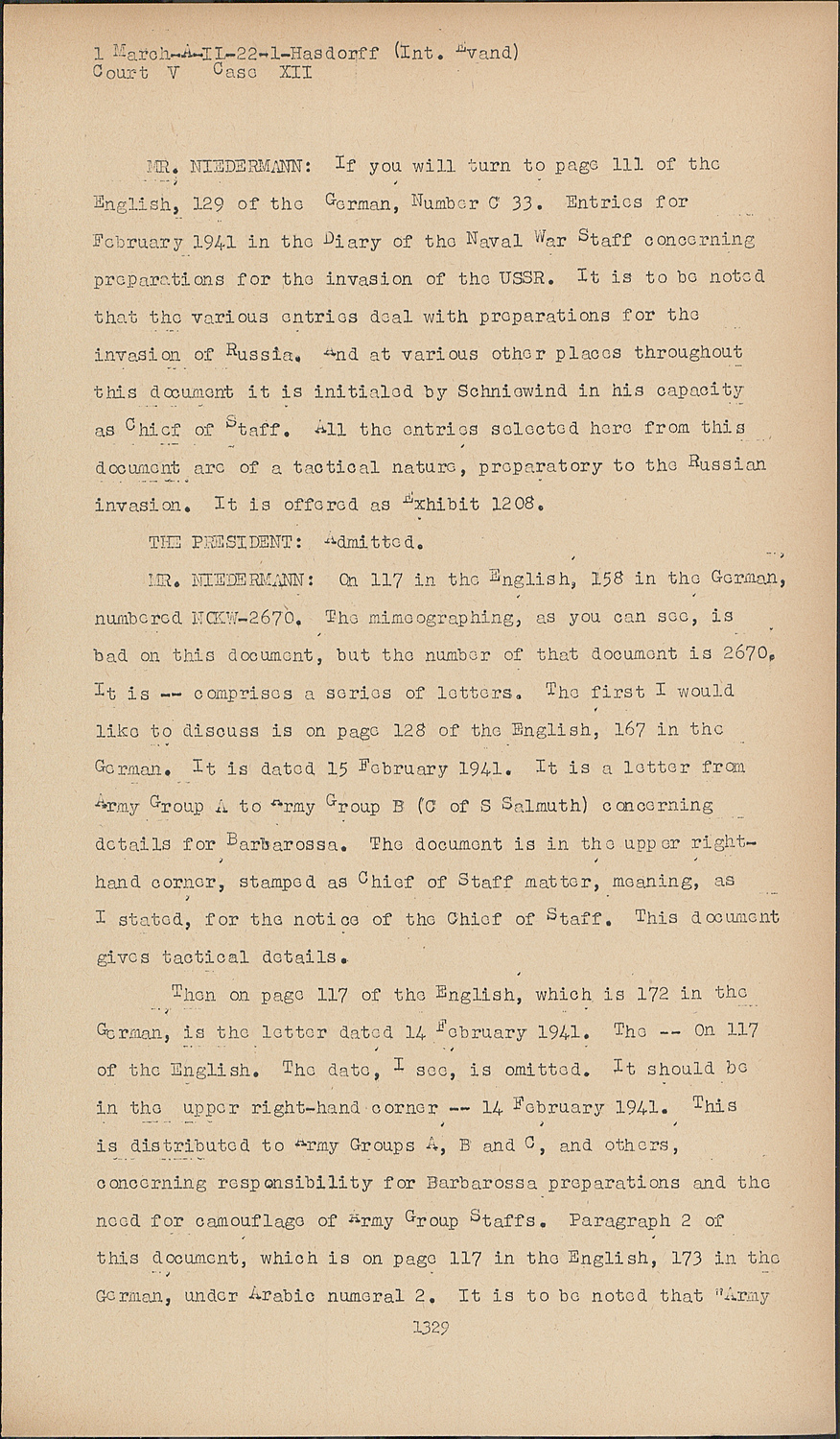 MR. NIEDERMANN:If you will turn to page 111 of the English, 129 of the German, Number C 33. Entries for February 1941 in the Diary of the Naval war Staff concerning preparations for the invasion of the USSR. It is to be noted that the various entries deal with preparations for the invasion of Russia. And at various other places throughout this document it is initialed by Schniewind in his capacity as Chief of Staff. all the entries selected here from this document are of a tactical nature, preparatory to the Russian invasion. It is offered as exhibit 1208.