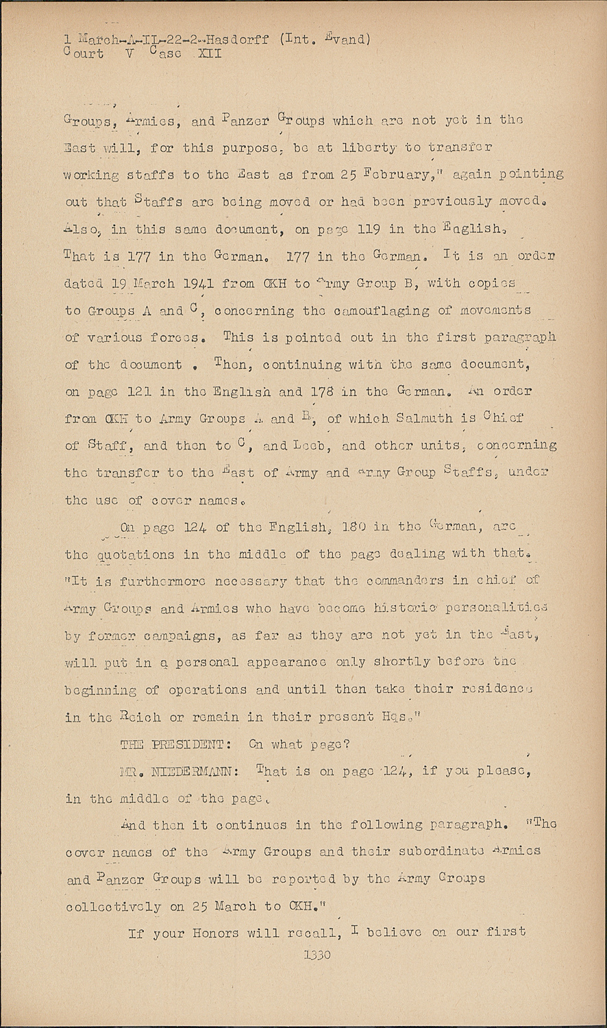 Also, in this same document, on page 119 in the English. That is 177 in the German. 177 in the German. It is order dated 19 March 1941 from OKH to army Group B, with copies to Groups A and C, concerning the camouflaging of movements of various forces. This is pointed out in the first of the document. Then, continuing with the same document, on page 121 in the English and 178 in the German. An order from OKH to Army Groups A and B, of which Salmuth is Chief of Staff, and then to C, and Leeb and other units, concerning the transfer to the East of Army and Arny Group staffs, under the use of cover names.
