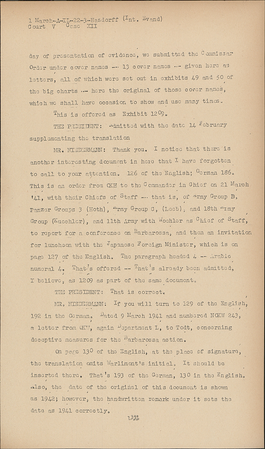 MR. NIEDERMANN:Thank you. I notice that there is another interesting document in here that I have forgotten to call to your attention. 126 of the English; German 186. This is ail order from OKH to the Commander in Chief on 21 March '41, with their Chiefs of staff -- that is, of Army Group B, Panzer Groups 3 (Hoth), Army Group C, (Leeb); and 18th Army Group (Kuechler), and 11th Army with Woehler as Chief of staff, to report for a conference on Barbarossa, and then an invitation for luncheon with the Japanese Foreign Minister, which is on page 127 of the English The paragraph headed 4 -- Arabic numeral 4. That's offered -- That's already been admitted, I believe, as 1209 as part of the same document.