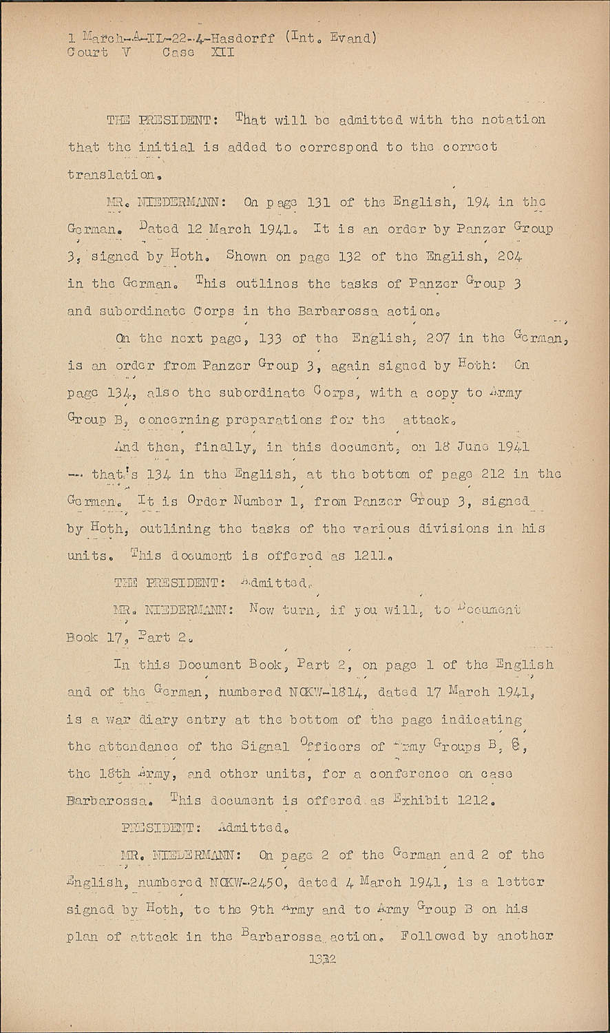 And then, finally, in this document, on 18 June 1941 -- that's 134 in the English, at the bottom of page 212 in the German. It is Order Number 1, from Panzer Group 3, signed by Hoth, outlining the tasks of the carious divisions in his units. This document is offered as 1211.
