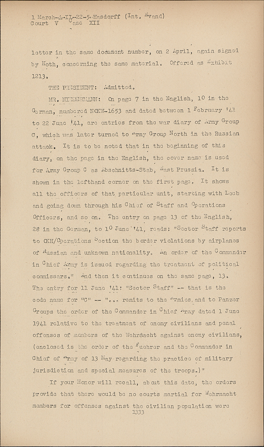 MR. NIEDERMANN:On page 7 in the English, 10 in the German, numbered NOKW-1653 and dated between 1 February '41 to 22 June '41, are entries from the war diary of Army Group C, which was later turned to Army Group North in the Russian attack. It is to be noted that in the beginning of this diary, on the page in the English, the cover name is used for Army Group C as Abschnitts-Stab, East Prussia. It is shown in the lefthand corner on the first page. It shows all the officers of that particular unit, starting with Leeb and going down through his Chief of Staff and operations Officers, and so on. The entry on page 13 of the English, 28 in the German, to 10 June '41, reads: "Sector Staff reports to OKH/Operations Section the border violations by airplanes of Russian and unknown nationality. An order of the Commander in Chief Army is issued regarding the treatment of political commissars." And then it continues on the same page, 13. The entry for 11 June '41: "Sector staff" -- that is the code name for "C" -- "... remits to the Armies, and to Panzer Groups the order of the Commander in Chief Army dated 1 June 1941 relative to the treatment of enemy civilians and penal offenses of members of the Wehrmacht against enemy civilians, (enclosed is the order of the Fuehrer and the Commander in Chief of Army of 13 May regarding the practice of military jurisdiction and special measures of the troops.)" If your Honor will recall, ab cut this date, the orders provide that there would be no courts martial for Wehrmacht members for offenses against the civilian population were distributed and about 10 June the order for treatment of the political Commissars was issued.
