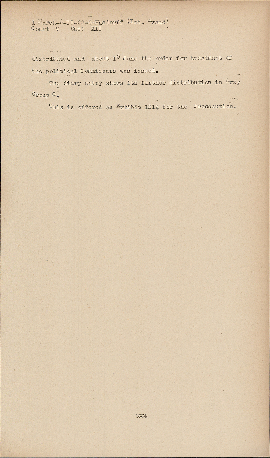 Then, if I may quote on page 26, that's 53 in the German, the entry of 21 July 1941, the last sentence, "A political Commissar among them is executed," you will recall this is an entry of the Panzer Corps in Panzer Group 3 commanded by Hoth. It is offered as Exhibit 1216.