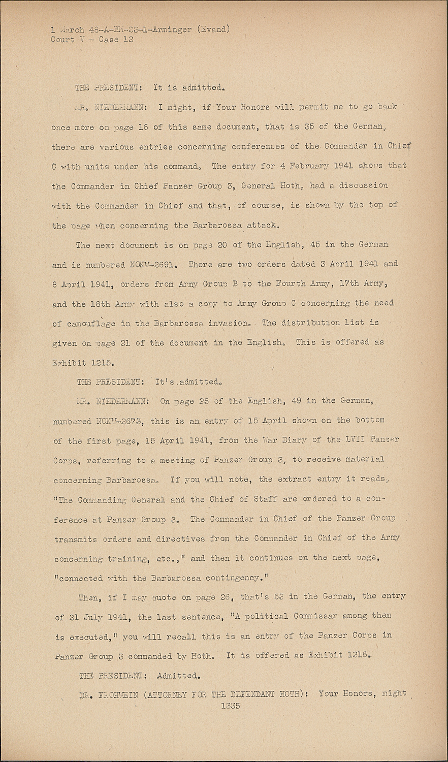 MR. NIEDERMANN:I might, if Your Honors will permit me to go back once more on page 16 of this same document, that is 35 if the German, there are various entries concerning conferences of the Commander in Chief C with units under his command. The entry for 4 February 1941 shows that the Commander in Chief Panzer Group 3, General Hoth, had a discussion with the Commander in Chief and that, of course, is shown by the top of the page when concerning the Barbarossa attack.