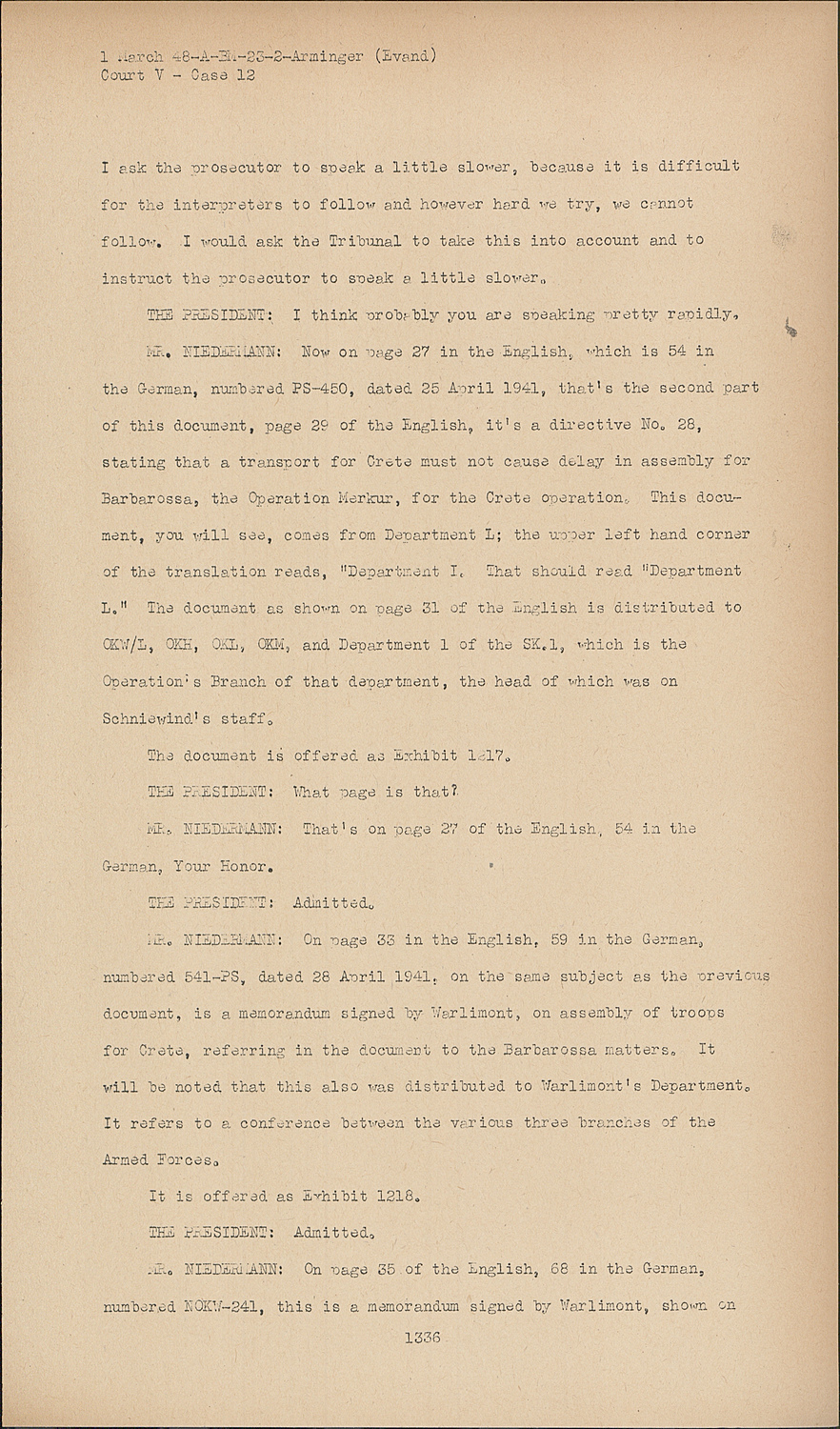 MR. NIEDERMANN:Now on Page 27 in the English, which is 54 in the German, numbered PS-450, dated 25 April 1941, that's the second part of this document, page 29 of the English, it's a directive No. 28, stating that a transport for Crete must not cause delay in assembly for Barbarossa, the Operation Merkur, for the Crete operation. This document, you will see, comes from Department L; the upper left hand corner of the translation reads, "Department I, That should read "Department L." The document as shown on page 31 of the English, is distributed to CKW, OKH, OKL, OKM, and Department 1 of the SK.1, which is the Operation's Branch of that department, the head of which was on Schniewind's staff.