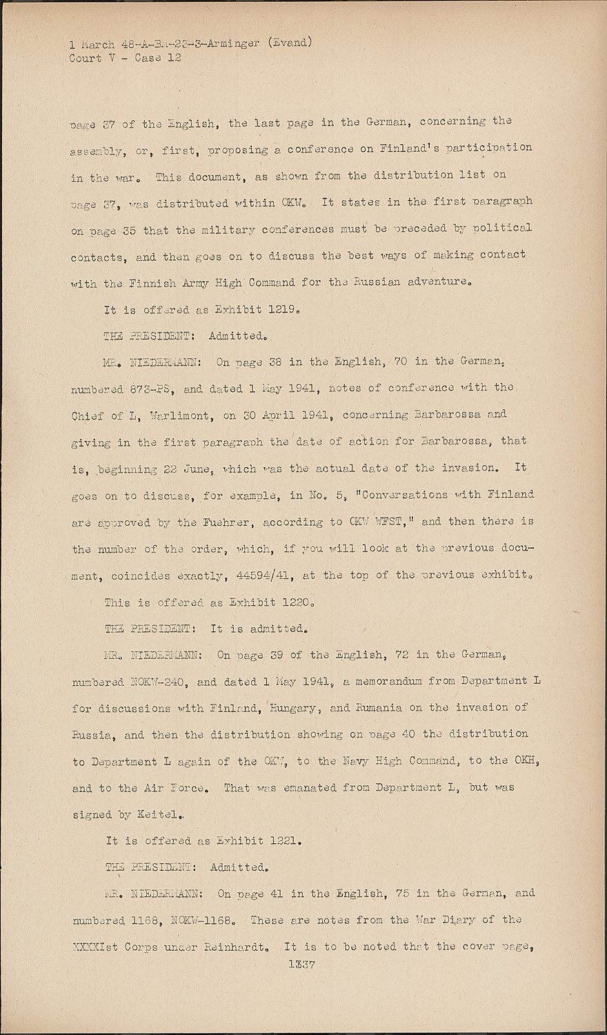 MR. NIEDERMANN:On Page 39 of the English, 72 in the German, numbered NOKW-240, and dated 1 May 1941, a memorandum from Department L for discussions with Finland, Hungary, and Rumania on the invasion of Russia, and then the distribution showing on page 40 the distribution to Department L again of the OKW, to the Navy High Command, to the OKH, and to the Air Force. That was emanated from Department L, but was signed by Keitel.