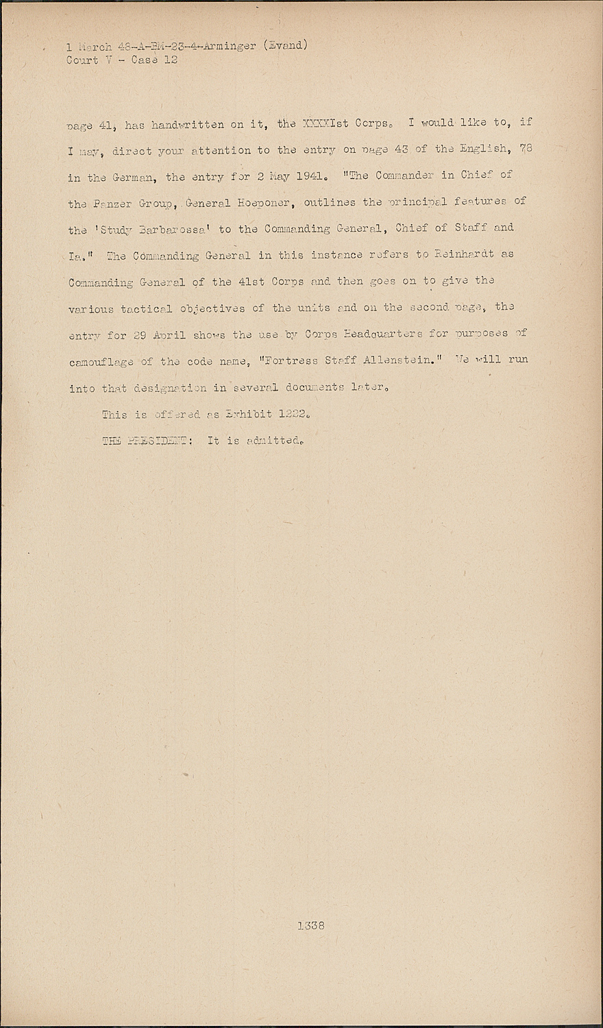 I would like to, of I may, direct your attention to the entry on page 43 of the English, 78 in the German, the entry for 2 hay 1941. "The Commander in Chief of the Panzer Group, General Hoeponer, outlines the principal features of the 'Study Barbarossa' to the Commanding General, Chief of Staff and Ia." The Commanding General in this instance refers to Reinhardt as Commanding General of the 41st Corps and then goes on to give the various tactical objectives of the units and on the second page, the entry for 29 April shows the use by Corps Headquarters for purposes if camouflage of the code name, "Fortress Staff Allenstein." We will run into that designation in several documents later.