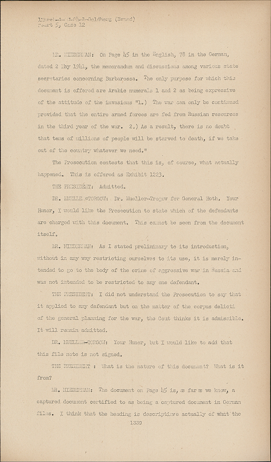 MR.NIEDERMAN: on Page 45 in the English, 78 in the German, dated 2 May 1941, the memorandum and discussions among various state secretaries concerning Barbarossa. The only purpose for which this document is offered are Arabic numerals 1 and 2 as being expressive of the attitude of the invasions "1.) The war can only be continued provided that the entire armed forces are fed from Russian resources in the third year of the war. 2.) As a result, there is no doubt that tens of millions of people will be starved to death, if we take out of the country whatever we need."