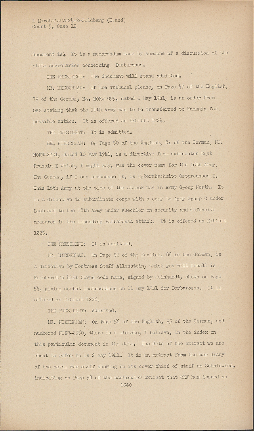 MR. NIEDERMAN:On Page 50 of the English, 81 of the German, NO. NOKW-2701, dated 10 May 1941, is a directive from sub-sector East Prussia I which, I might say, was the cover name for the 16th Army. The German, if I can pronounce it, is Unterabschnitt Ostpreussen I. This 16th Army at the time of the attack was in Army Group North. It is a directive to subordinate corps with a copy to Army Group C under Leeb and to the 18th Army under Kuechler on security and defensive measures in the impending Barbarossa attack. It is offered as Exhibit 1225.