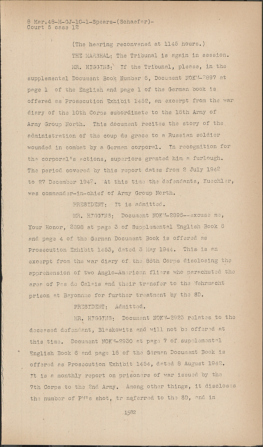MR. HIGGINS: If the Tribunal, please, in the supplemental Document Book Number 6, Document NOKW-2897 at page 1 of the English and page 1 of the German book is offered as Prosecution Exhibit 1452, an excerpt from the war diary of the 10th Corps subordinate to the 16th Army of Army Group North. This document recites the story of the administration of the coup de grace to a Russian soldier wounded in combat by a German corporal. In recognition for the corporal's actions, superiors granted him a furlough. The period covered by this report dates from 2 July 1942 to 27 December 1942. At this time the defendants, Kuechler, was commander-in-chief of Army Group North.