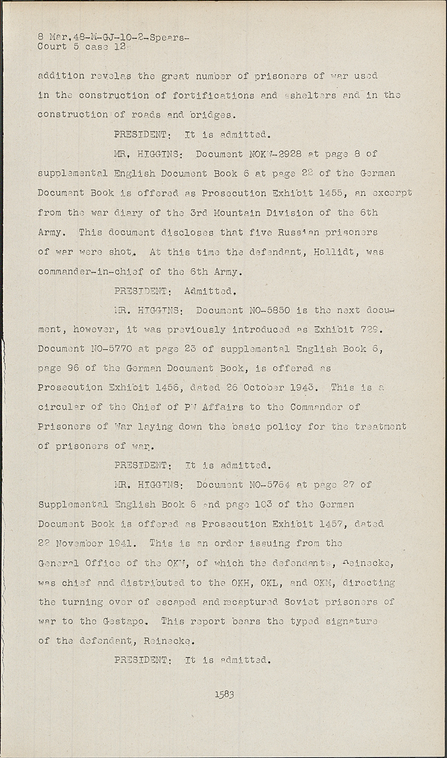 MR. HIGGINS: Document NO-5850 is the next document, however, it was previously introduced Exhibit 729. Document NO-5770 at page 23 of supplemental English Book 6, page 96 of the German Document Book, is offered as Prosecution Exhibit 1456, dated 26 October 1943. This is a circular of the Chief of PW Affairs to the Commander of Prisoners of War laying down the basic policy for the treatment of prisoners of war.
