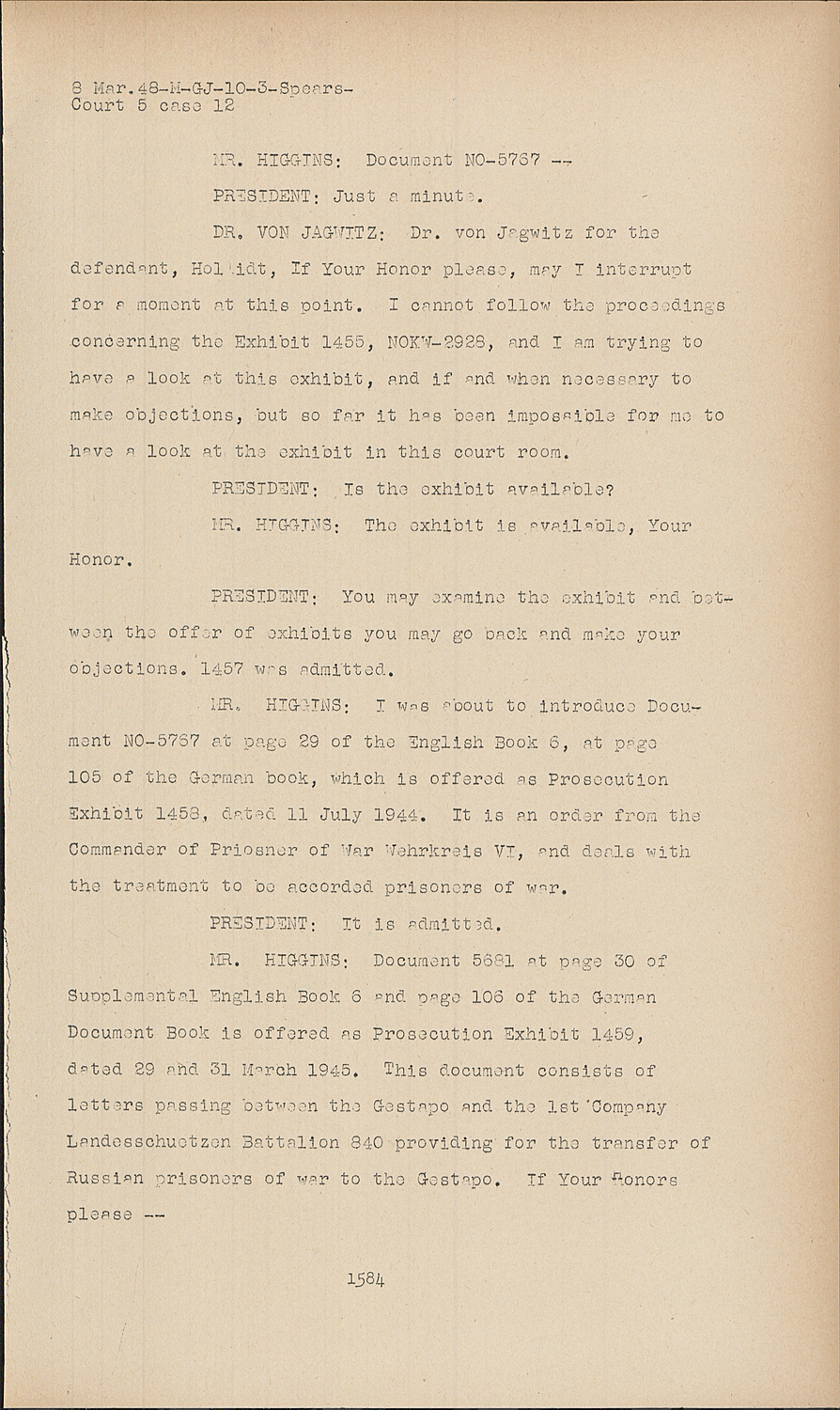MR. HIGGINS: Document 5681 at page 30 of Supplemental English Book 6 and page 106 of the German Document Book is offered as Prosecution Exhibit 1459, dated 29 and 31 march 1945. This document consists of letters passing between the Gestapo and the 1st Company Landessehuctzen Battalion 840 providing for the transfer of Russian prisoners of war to the Gestapo. If Your honors please -