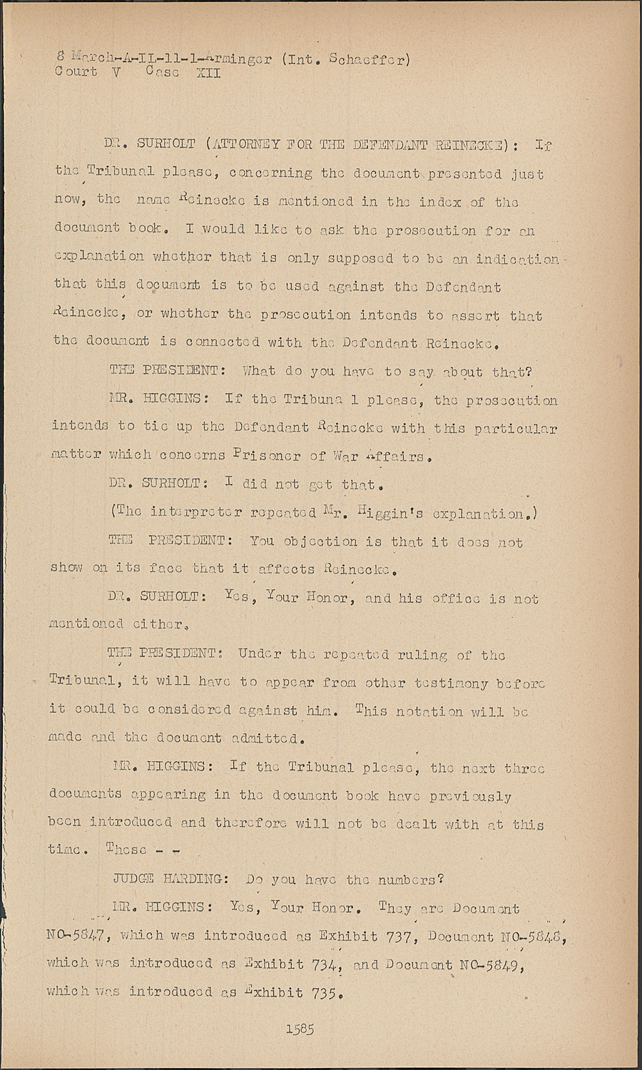 DR.SURHOLT (ATTORNEY FOR THE DEFENDANT REINECKE) : If the Tribunal please, concerning the document presented just now, the name Reinecke is mentioned in the index of the document book. I would like to ask the prosecution for an explanation whether that is only supposed to be an indication that this document is to be used against the Defendant Reineckc, or whether that prosecution intends to assert that the document is connected with the Defendant Reinecke.