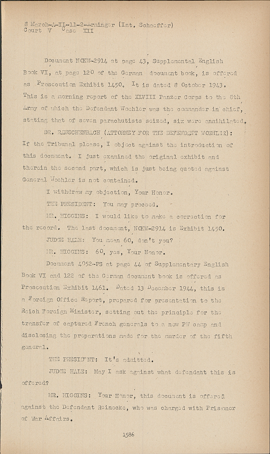 MR. HIGGINS: I was about to introduce Document NO-5767 at page 29 of the English Book 6, at page 105 of the German book, which is offered as prosecution Exhibit 1453, dated 11 July 1944. It is an order from the Commander of Priosner of War Wehrkreis VI, and deals with the treatment to be accorded prisoners of war.