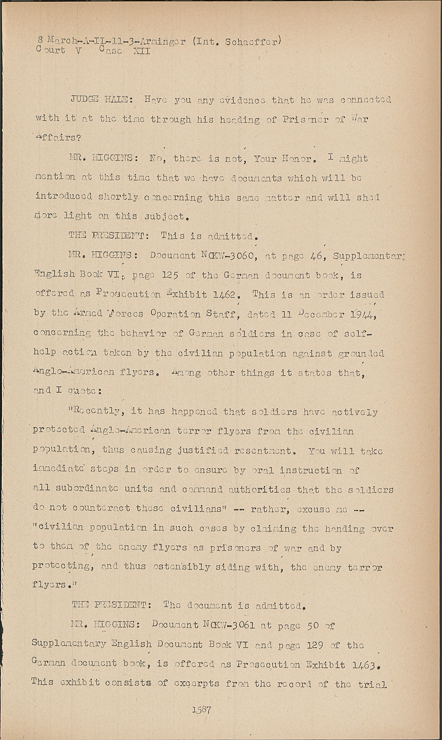 MR. HIGGINS:Document NOKW-3060, at page 46, Supplementary English Book VI, page 125 of the German document book, is offered as prosecution Exhibit 1462. This is on order issued by the Armed Forces Operation Staff, dated 11 December 1944, concerning the behavior of German soldiers in case of selfhelp action taken by the civilian population against grounded Anglo-American flyers. Among other things it states that, and I quote:
