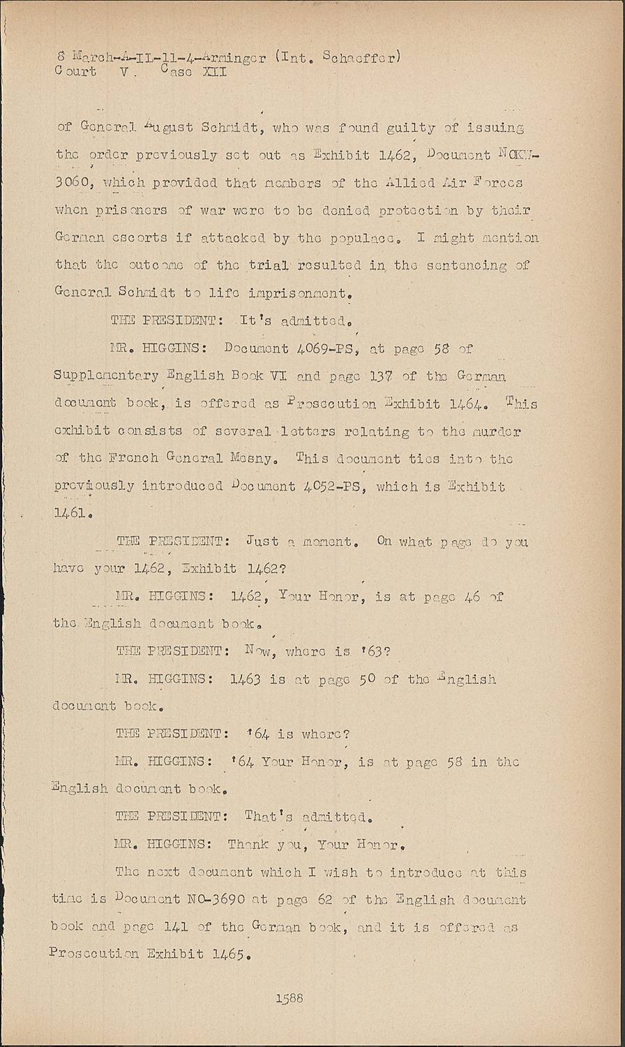 MR. HIGGINS:Document 4069-PS, at age 58 of Supplementary English Book VI page 137 of German document book, is offered as Prosecution Exhibit 1464. This exhibit consists of several letters relating to the murder of the French General Mesny. This document ties into the previously introduced document 4052-PS, which is Exhibit 1461.