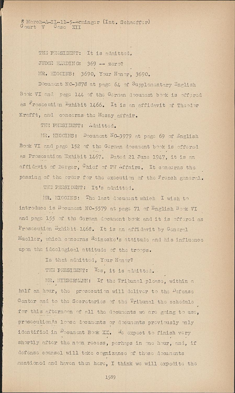 Document NO-3878 at page 64 of Supplementary English Book VI and page 144 of the German document book is offered as Prosecution Exhibit 1466. It is an affidavit of Theodor Krafft, and concerns the Mesny affair.
