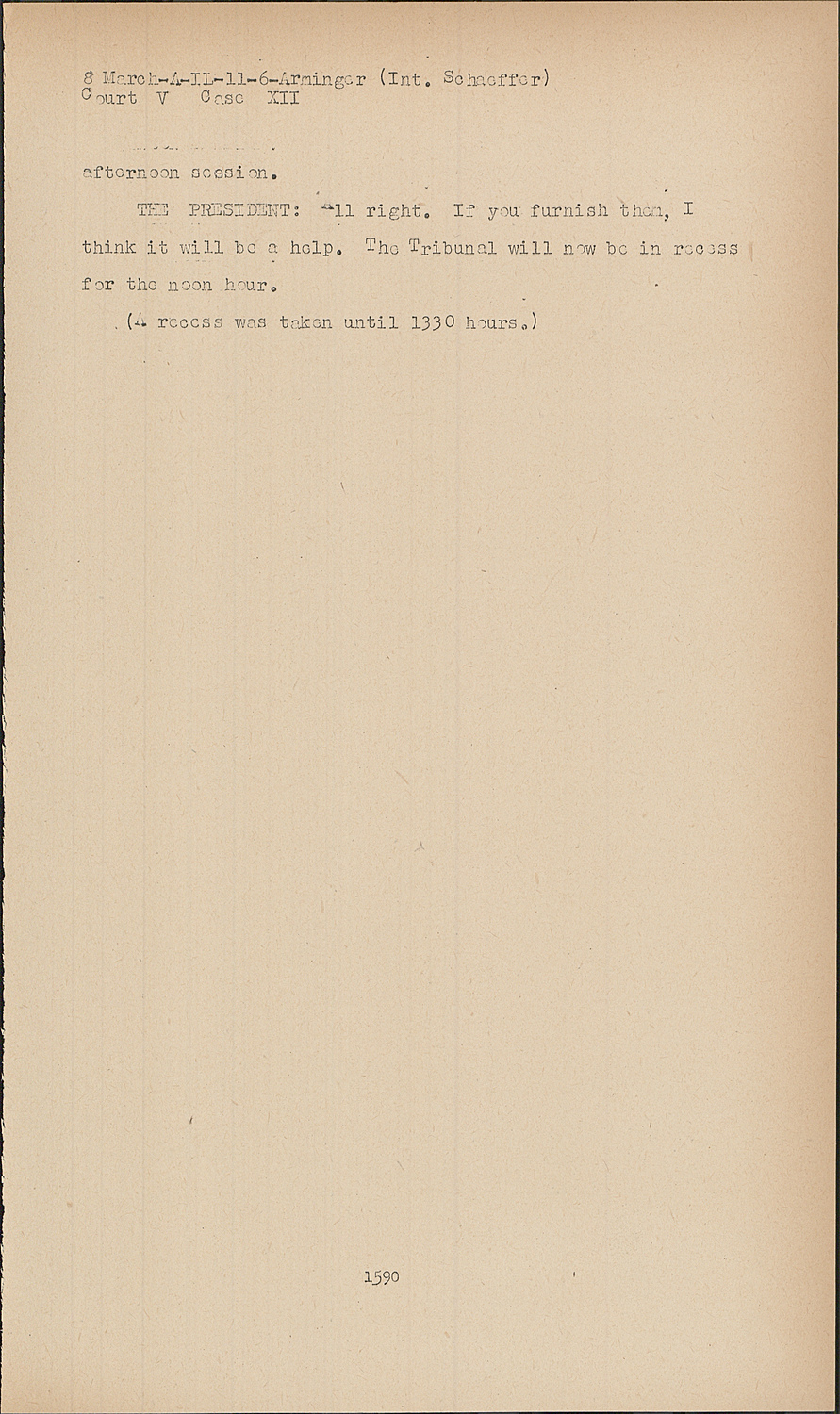 MR. PRESIDENT:If the Tribunal please, within a half an hour, the prosecution Well deliver to the Defense Center and to the Secretaries of the tribunal the schedule for this afternoon of all the documents we are going to use, prosecution's loose documents or documents previously only identified in document Book XX. We expect to finish very shortly after the noon recess, perhaps in one hour, and, if defense counsel will take cognizance of those documents mentioned and haven them here, I think we will expedite the afternoon session.