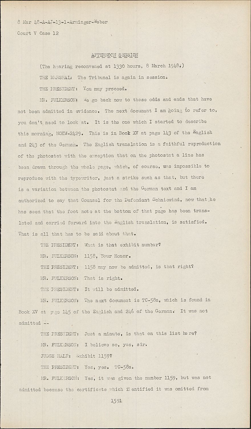 MR. NIEDERMAN:On Page 26 of the English, 22 in the German, and dated 19 December 1947, is an affidavit by Admiral Heye identifying Schniewind's initials.
