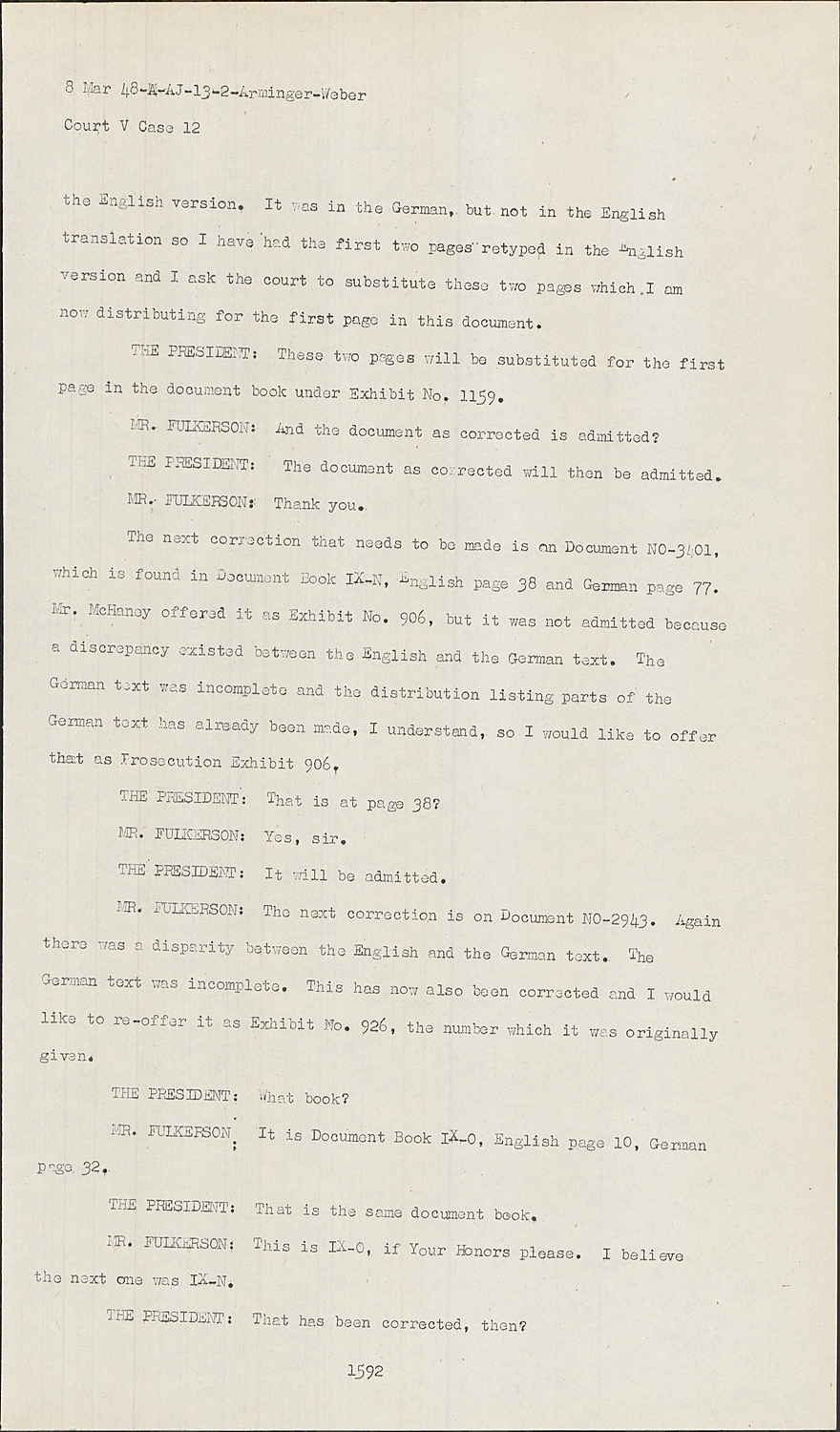 The next correction that needs to be made is on Document NO-3401, which is found in Document Book IX-N, English page 38 and German page 77. Mr. McHaney offered it as Exhibit No. 906, but it was not admitted because a discrepancy existed between the English and the German text. The German text was incomplete and the distribution listing parts of the German text has already been made, I understand, so I would like to offer that as Prosecution Exhibit 906