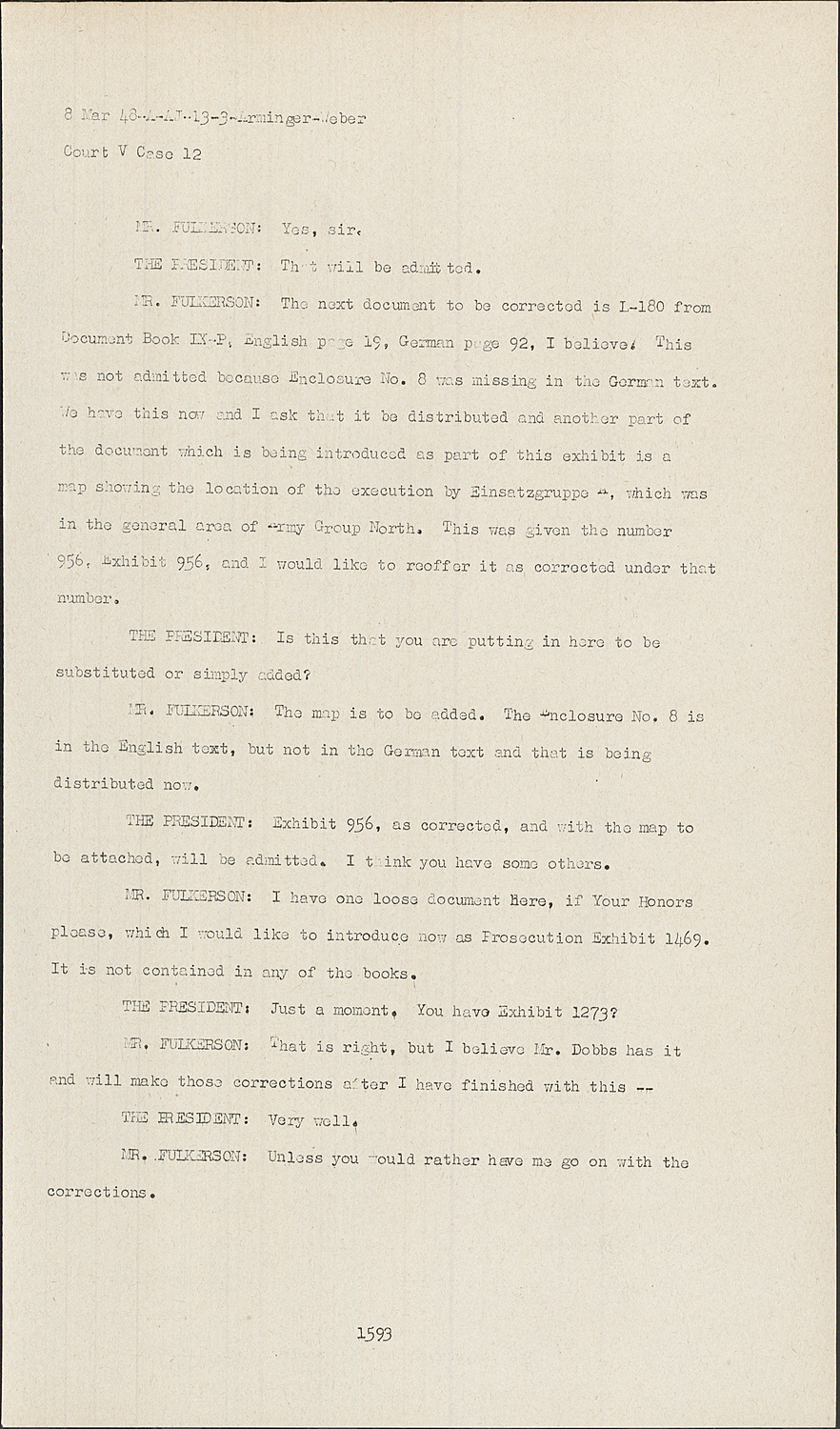 MR. FULKERSON:The next document to be corrected is L-180 from document Book IX-P, English page 19, German page 92, I believe. This was not admitted because Enclosure No. 8 was missing in the German text, we have this now and I ask that it be distributed and another part of the document which is being introduced as part of this exhibit is a map showing the location of the execution by Einsatzgruppe A, which was in the general area of Army Group North. This was given the number 956, Exhibit 956, and I would like to reoffer it as corroctod under that number.