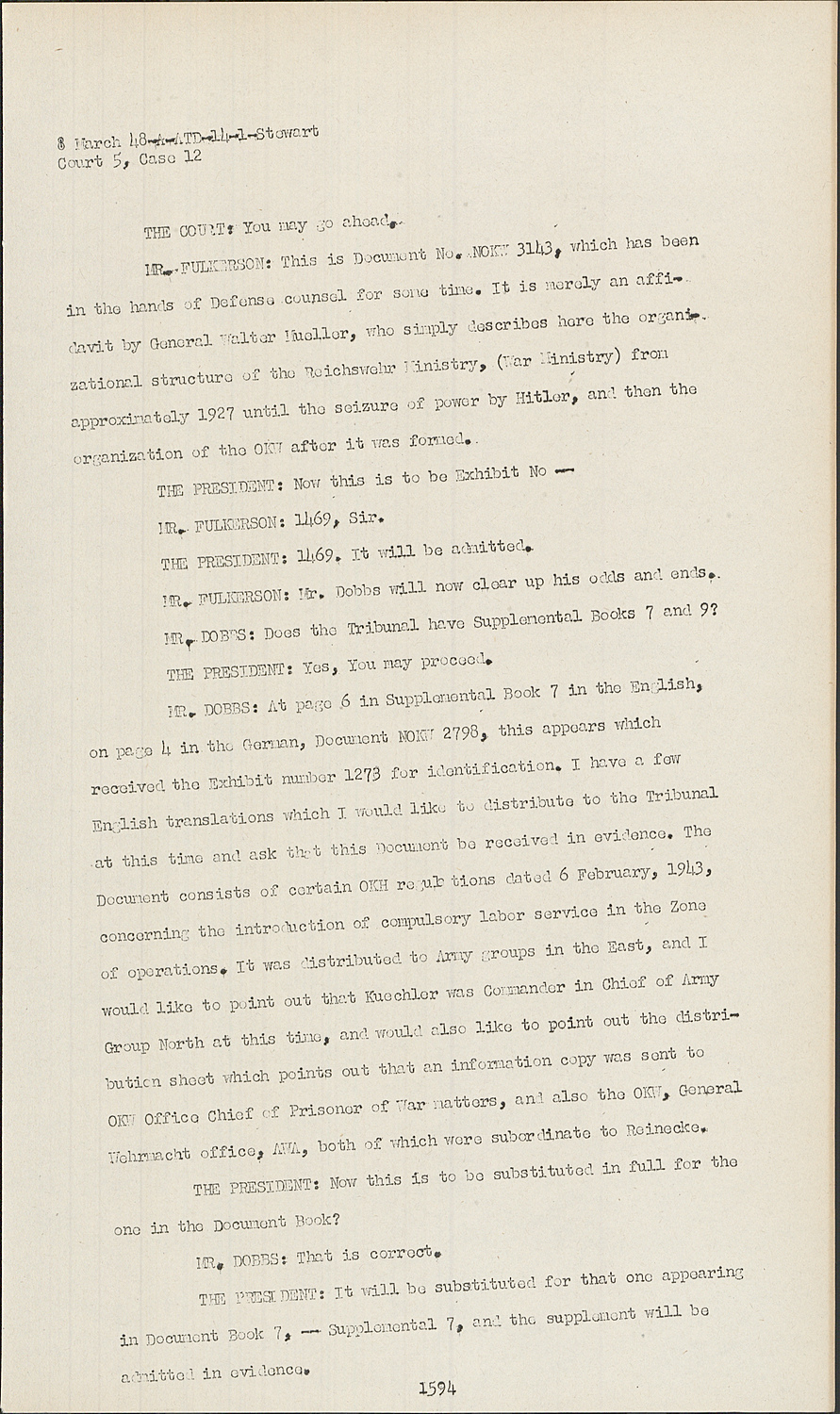 MR. DOBBS:At page 6 in Supplemental Book 7 in the English, on page 4 in the German, Document NOKW 2798, this appears which received the Exhibit number 1273 for identification. I have a few English translations which I would like to distribute to the Tribunal at this time and ask that this Document be received in evidence. The Document consists of certain OKH regulations dated 6 February, 1943, concerning the introduction of compulsory labor service in the Zone of operations. It was distributed to Army groups in the East, and I would like to point out that Kuechler was Commander in Chief of Army Group North at this time, and would also like to point out the distribution sheet which points out that an information copy was sent to OKW Office Chief of Prisoner of War matters, and also the OKW, General Wehrmacht office, AWA, both of which were subordinate to Reinecke.