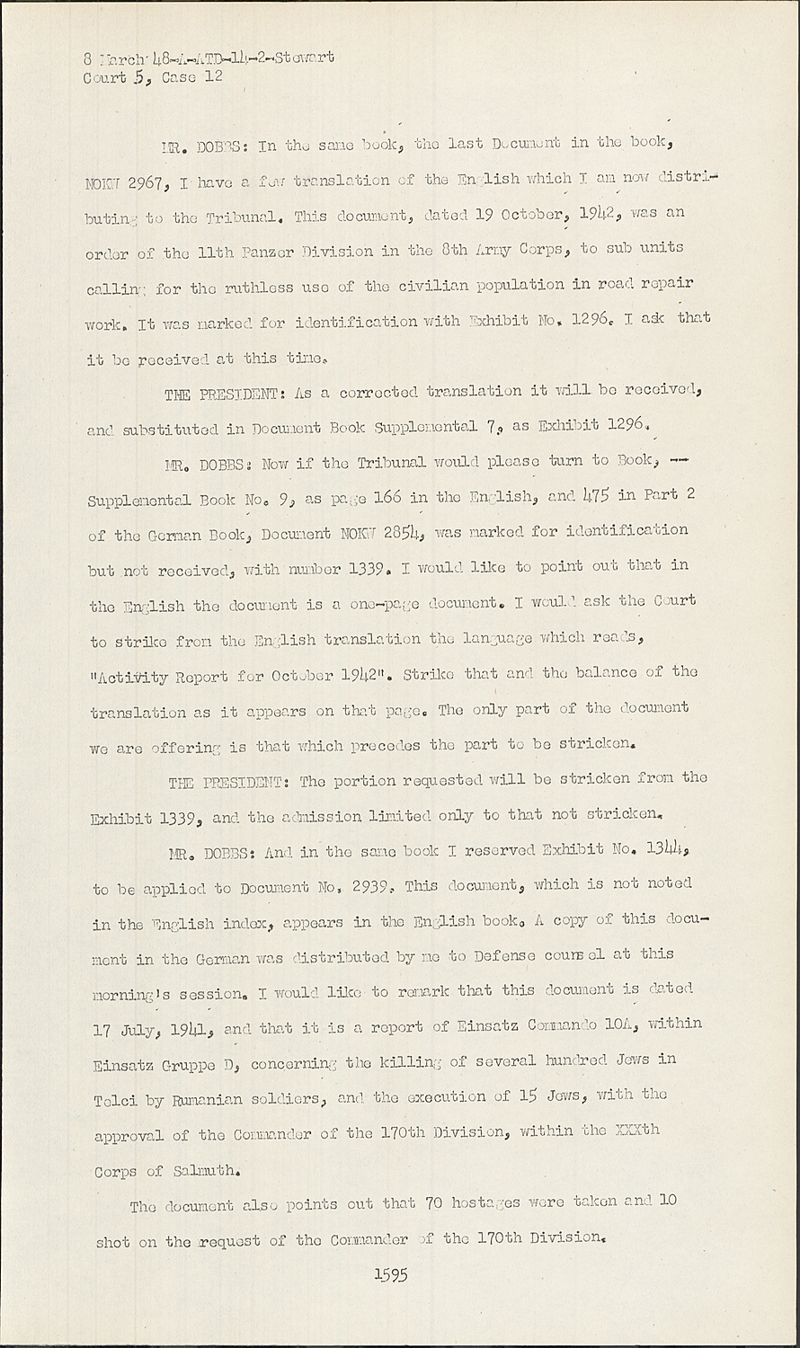 MR. DOBBS:In the same book, the last Document in the book, NOKW 2967, I have a few translation of the English which I am now distributing to the Tribunal. This document, dated 19 October, 1942, was an order of the 11th Panzer Division in the 8th Army Corps, to sub units calling for the ruthless use of the civilian population in road repair work. It was marked for identification with Exhibit No. 1296. I ask that it be received at this time.