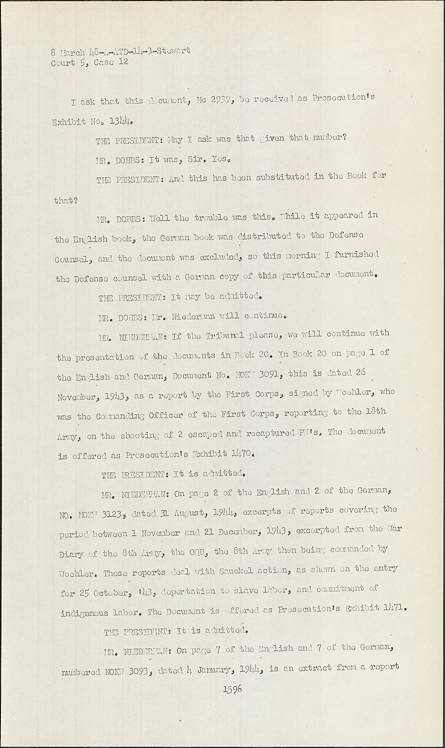 MR. NIEDERIAN:If the Tribunal please, we will continue with the presentation of the documents in Book 20. In Book 20 on page 1 of the English and German, Document No. NOKW 3091, this is dated 26 November, 1943, as a report by the First Corps, signed by Woehler, who was the Commanding Officer of the First Corps, reporting to the 18th Army, on the shooting of 2 escaped and recaptured PW'S. The document is offered as Prosecution's Exhibit 1470.