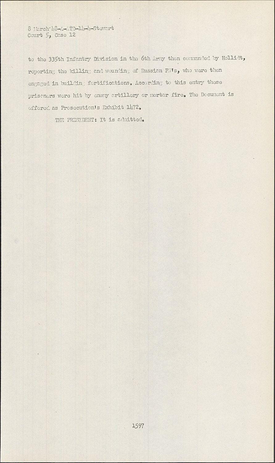 MR. NIEDERMAN:On page 7 of the English and 7 of the German, numbered NOKW-3093, dated 4 January, 1944, is an extract from a report to the 335th Infantry Division in the 6th Army then commanded by Hollidt, reporting the killing and wounding of Russian PWs, who were then engaged in building fortifications.