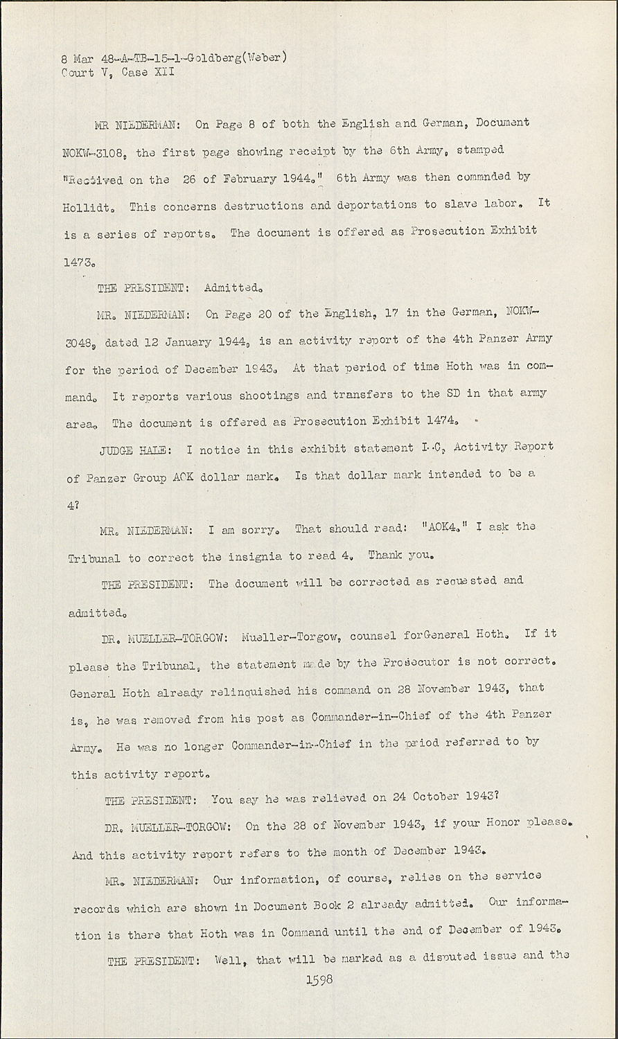MR. NIEDERMAN:On Page 20 of the English, 17 in the German, NOKW3048, dated 12 January 1944, is an activity report of the 4th Panzer Army for the period of December 1943. At that period of time Hoth was in command. It reports various shootings and transfers to the SD in that army area. The document is offered as Prosecution Exhibit 1474.