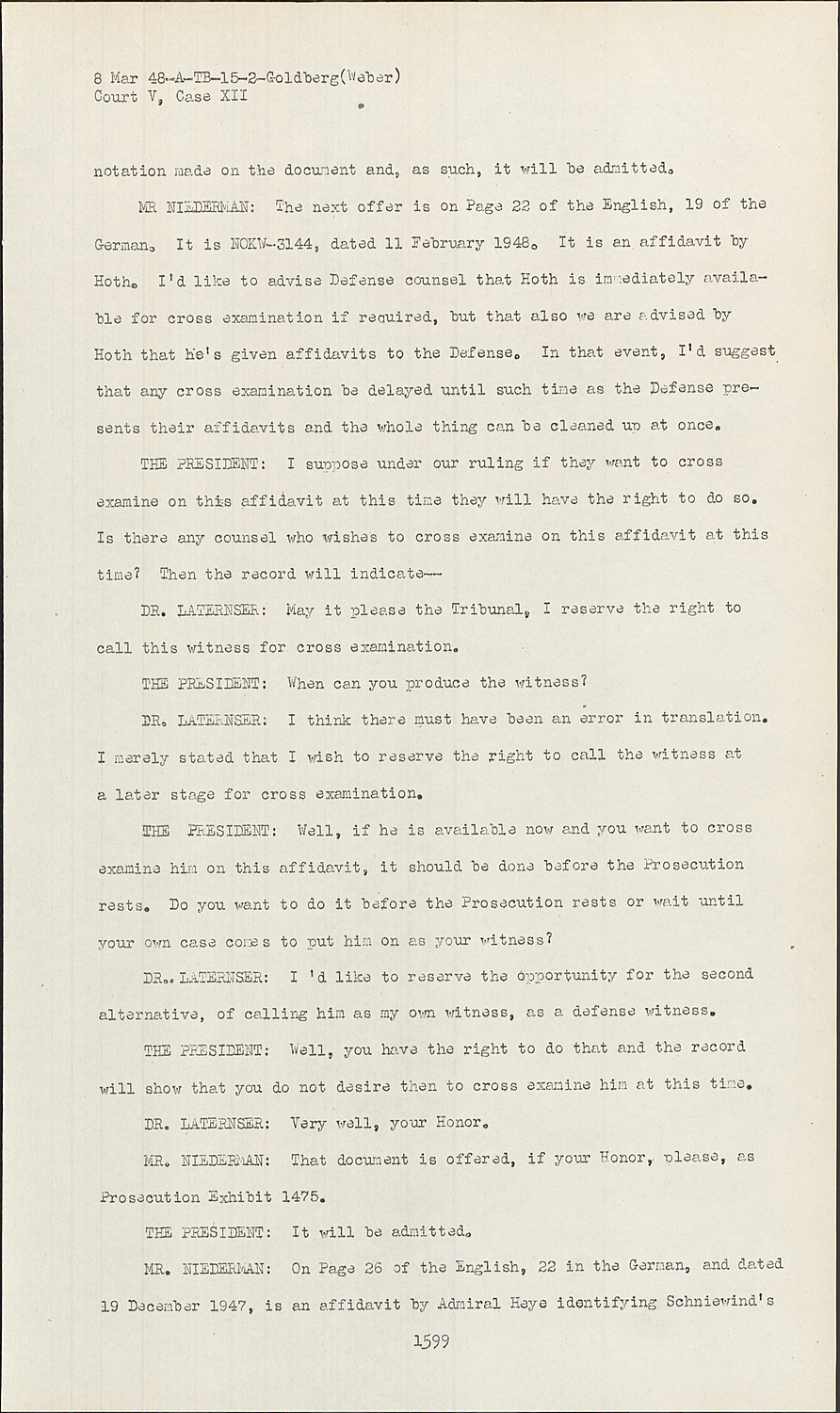 MR NIEDERMAN:The next offer is on Page 22 of the English, 19 of the German. It is NOKW-3144, dated 11 February 1948. It is an affidavit by Hoth. I'd like to advise Defense counsel that Hoth is immediately available for cross examination if required, but that also we are advised by Hoth that he's given affidavits to the Defense. In that event, I'd suggest that any cross examination be delayed until such time as the Defense presents their affidavits and the whole thing can be cleaned up at once.