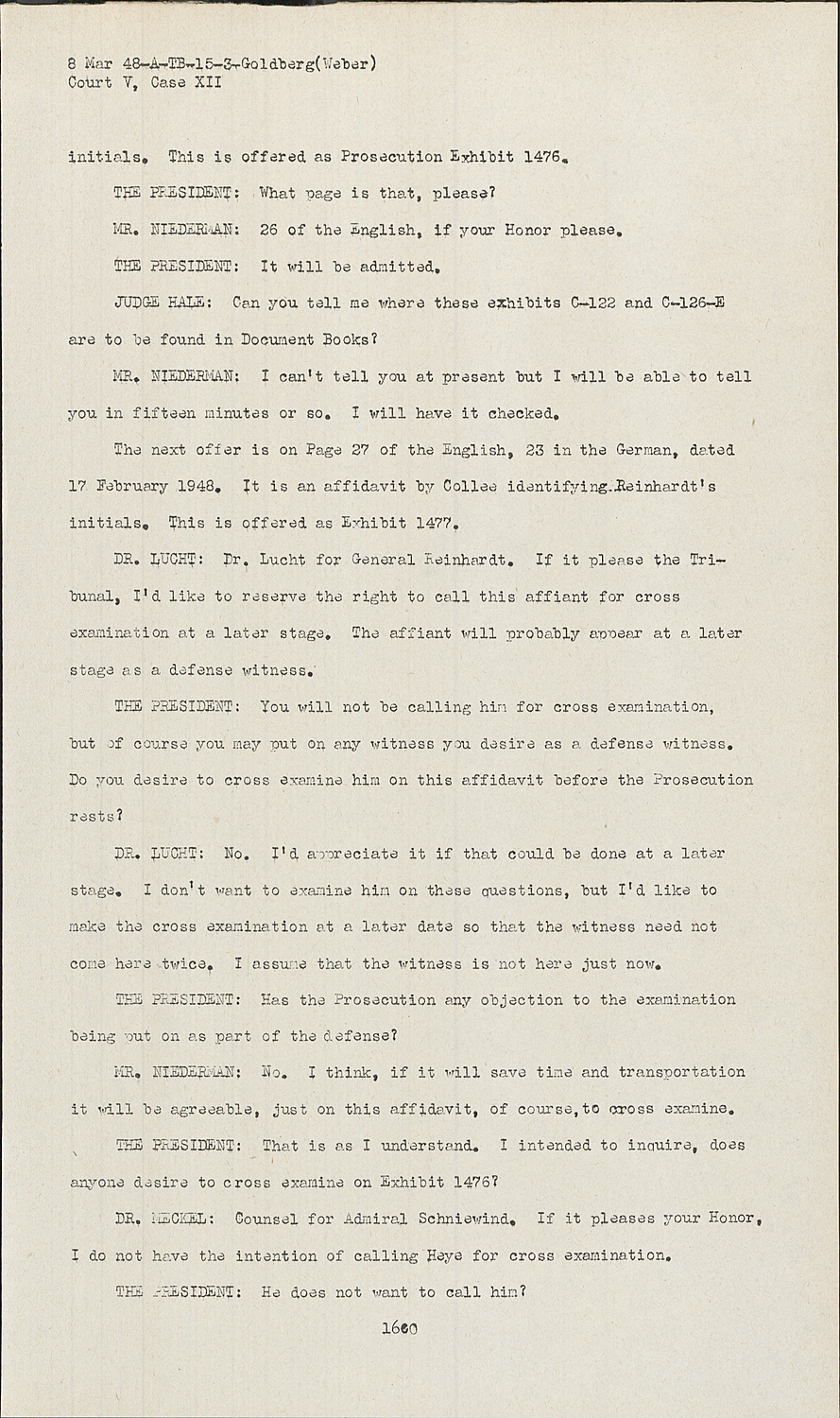 DR. LUCHT:Dr. Lucht for General Reinhardt. If it please the Tribunal, I'd like to reserve the right to call this affiant for cross examination at a later stage. She affiant Will probably appear at a later stage as a defense witness.