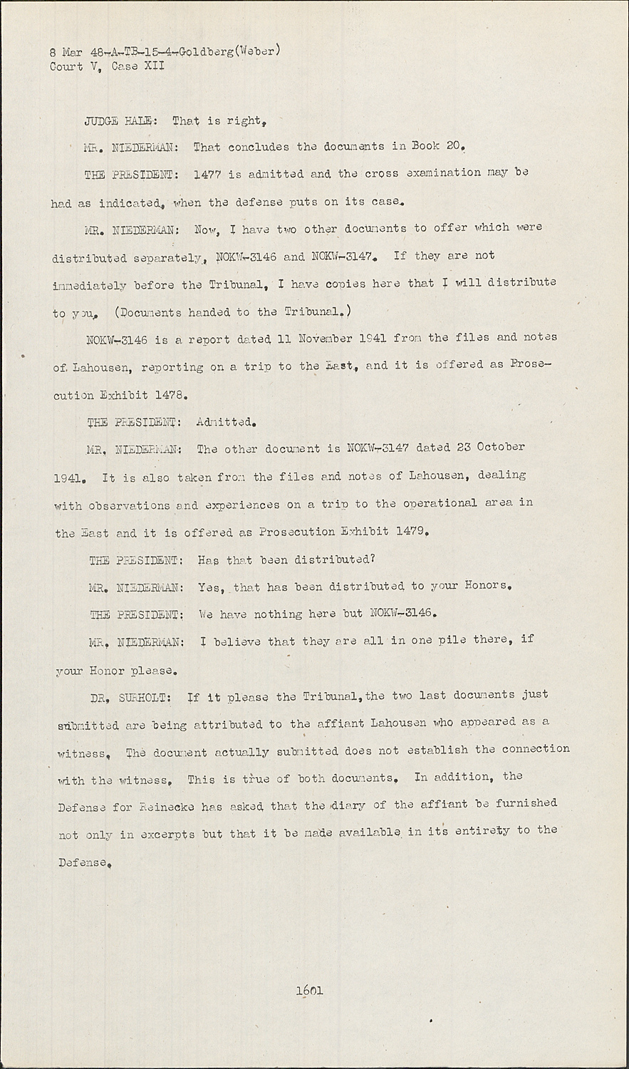 DR. SURHOLT:If it please the Tribunal, the two last documents just submitted are being attributed to the affiant Lahousen who appeared as a witness. The document actually submitted does not establish the connection with the witness. This is true of both docunents. In addition, the Defense for Reinecke has asked that the diary of the affiant be furnished not only in excerpts but that it be made available in its entirety to the Defense,