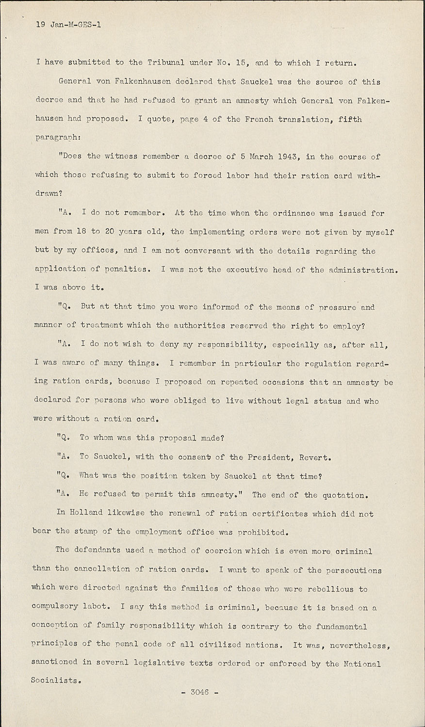 "A. I do not wish to deny my responsibility, especially as, after all, I was aware of many things. I remember in particular the regulation regarding ration cards, because I proposed on repeated occasions that an amnesty be declared for persons who were obliged to live without legal status and who were without a ration card.