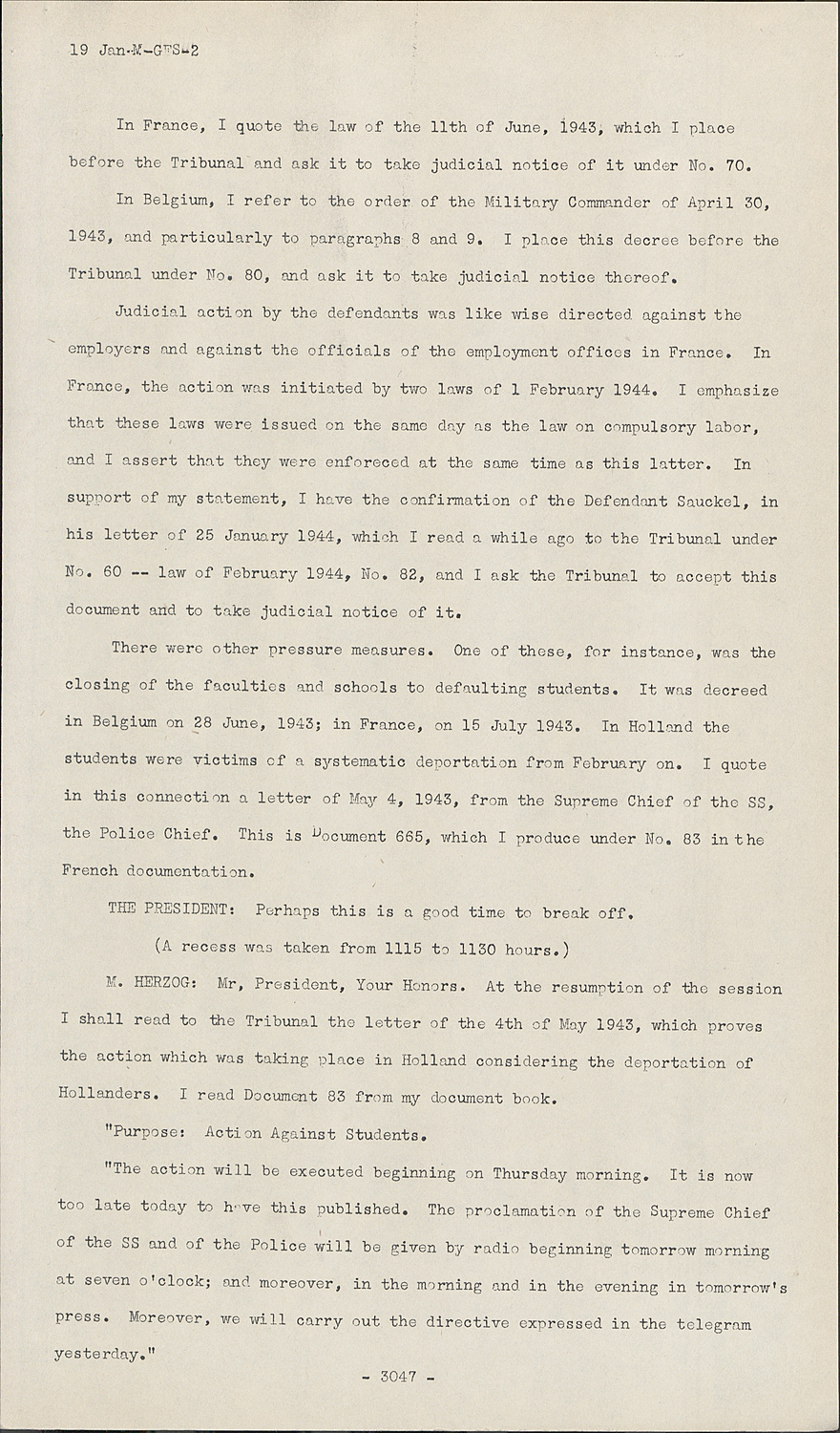 M. HERZOG:Mr. President, Your Honors. At the resumption of the session I shall read to the Tribunal the letter of the 4th of May 1943, which proves the action which was taking place in Holland considering the deportation of Hollanders. I read Document 83 from my document book.