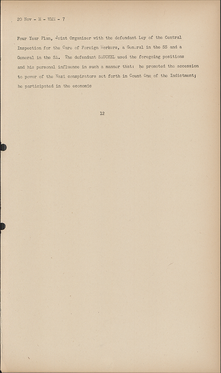 The defendant SAUCKEL used the foregoing positions and his personal influence in such a manner that: he promoted the accession to power of the Nazi conspirators set forth in Count One of the Indictment; he participated in the economic preparations for Wars of Aggression and Wars in Violation of Treaties, Agreements and Assurances set forth in Counts One and Two of the Indictment; he authorized, directed and participated in the War Crimes set forth in Count Three of the Indictment and the Crimes against Humanity set forth in Count Four of the Indictment, including particularly the War Crimes and Grimes against Humanity involved in forcing the inhabitants of occupied countries to work as slave laborers in occupied countries and in Germany.