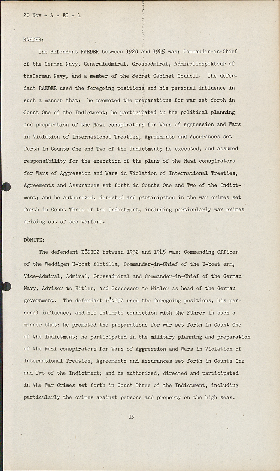 The defendant RAEDER between 1928 and 1945 was: Commander-in-Chief of the German Navy, Generaladmiral, Grossadmiral, Admiralinspekteur of theGerman Navy, and a member of the Secret Cabinet Council. The defendant RAEDER used the foregoing positions and his personal influence in such a manner that: he promoted the preparations for war set forth in Count One of the Indictment; he participated in the political planning and preparation of the Nazi conspirators for Wars of Aggression and Wars in Violation of International Treaties, Agreements and Assurances set forth in Counts One and Two of the Indictment; he executed, and assumed responsibility for the execution of the plans of the Nazi conspirators for Wars of Aggression and Wars in Violation of International Treaties, Agreements and Assurances set forth in Counts One and Two of the Indictment; and he authorized, directed and participated in the war crimes set forth in Count Three of the Indictment, including particularly war crimes arising out of sea warfare. DOENITZ: