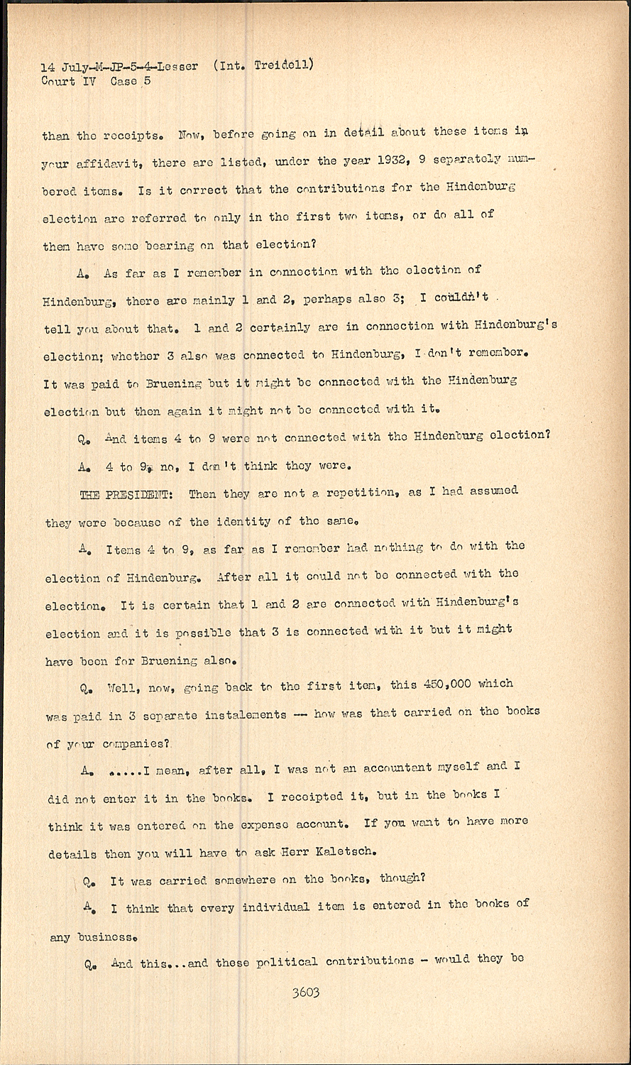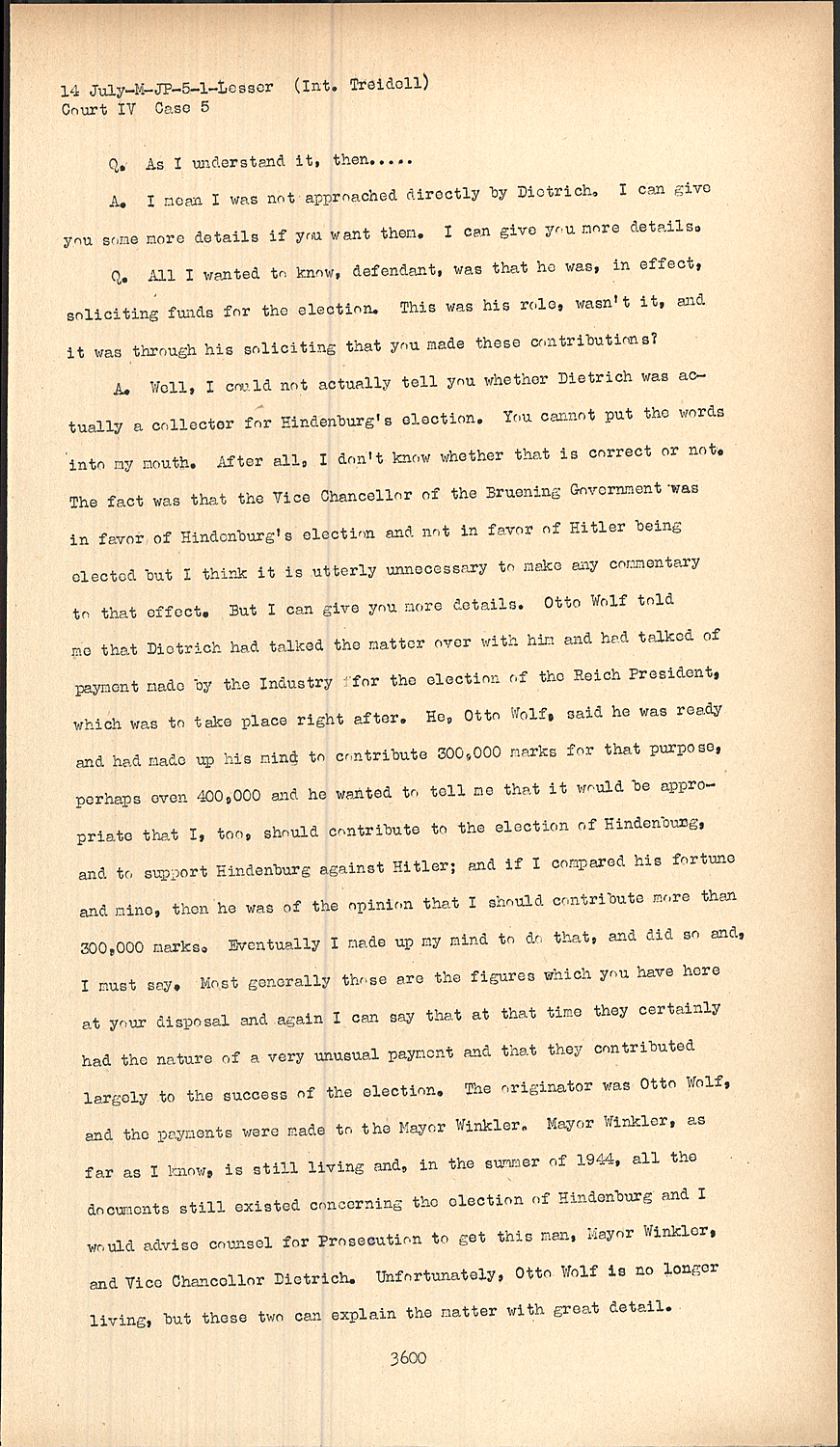 A.Well, I could not actually tell you whether Dietrich was actually a collector for Hindenburg's election. You cannot put the words into my mouth. After all, I don't know whether that is correct or not. The fact was that the Vice Chancellor of the Bruening Government was in favor of Hindenburg's election and not in favor of Hitler being elected but I think it is utterly unnecessary to make any commentary to that effect. But I can give you more details. Otto Wolf told me that Dietrich had talked the matter over with him and had talked of payment made by the Industry for the election of the Reich President, which was to take place right after. He, Otto Wolf, said he was ready and had made up his mind to contribute 300,000 marks for that purpose, perhaps over 400,000 and he wanted to tell me that it would be appropriate that I, too, should contribute to the election of Hindenburg, and to support Hindenburg against Hitler; and if I compared his fortune and mine, then he was of the opinion that I should contribute more than 300,000 marks. Eventually I made up my mind to do that, and did so and, I must say. Most generally those are the figures which you have here at your disposal and again I can say that at that time they certainly had the nature of a very unusual payment and that they contributed largely to the success of the election. The originator was Otto Wolf, and the payments were made to the Mayor Winkler. Mayor Winkler, as far as I know, is still living and, in the summer of 1944, all the documents still existed concerning the election of Hindenburg and I would advise counsel for Prosecution to get this man, Mayor Winkler, and Vice Chancellor Dietrich. Unfortunately, Otto Wolf is no longer living, but these two can explain the matter with great detail.